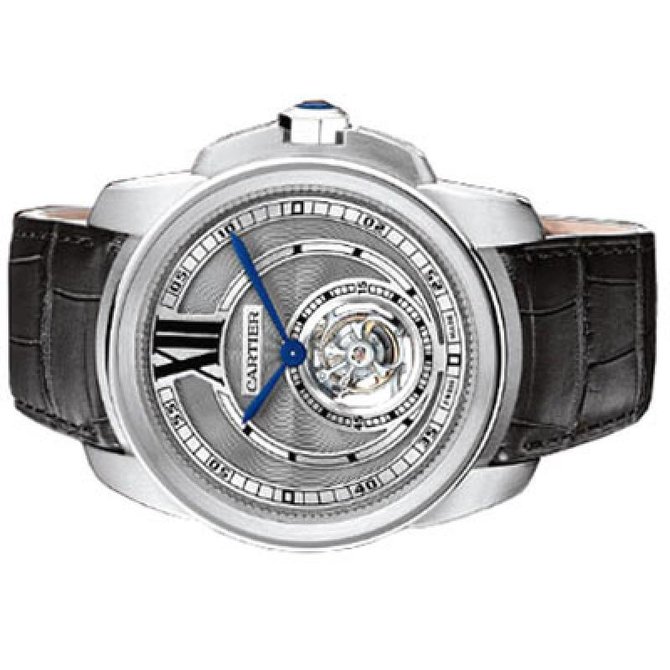 Пришло время ознакомиться с очередной коллекцией мужских наручных часов Calibre de Cartier, от известного во всем мире производителя часов Cartier, который завоевал сердца миллионов своими безупречными часовыми шедеврами в которые входят как и классические модели так и многофункциональные оригинальные часы. Рассмотрим модель Cartier Flying Tourbillon W7100003. Корпус выполнен в круглой форме, сделан из белого восемнадцати каратного золота. В диаметре размер корпуса составляет 45 мм. Основные функции модели это часы, минуты, секунды. Наверное главная особенность часов - это турбийон. Каретка турбийона находится на позиции шести часов. На циферблате великолепно смотрятся римские цифры. Также стоит упомянуть отлитые вручную из вороненной стали стрелки, которые ходят по серому циферблату. Циферблат закрывает прочное сапфировое стекло, а значит можно не переживать на счет появления царапин и прочих повреждениях. Автоматический механизм с оснащен калибром Cartier 9452 MC, и имеет запас хода на целых пятьдесят часов. ремешок черного цвета выполнен из кожи аллигатора. Водонепроницаемость модели скорее более стандартна чем увеличена, но тем не менее все равно не малая, и составляет тридцать метров. Насколько видно, от предыдущей модели, эти часы отличаются исключительно материалом корпуса а также цветом ремешков.
