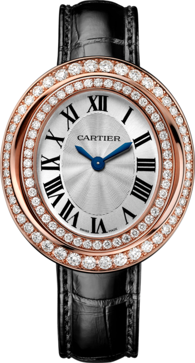 Французская компания Сartier, имеющая в своем активе мануфактуру по производству наручных часов в Швейцарии, представила свои ювелирные швейцарские часы HYPNOSE PINK GOLD DIAMONDS в корпусе из розового золота в форме яйца, декорированном белыми классическими бриллиантами. Под стеклом из сапфира, на гильошированном циферблате серебристого цвета синими воронеными стрелками показывается текущее время. Черный ремень изготовлен из кожи аллигатора и наделен золотой застежкой классического типа. За индикацию времени отвечает механизм кварцевого типа производства Сartier. Водонепроницаемость ювелирного корпуса из золота составляет 30 метров.