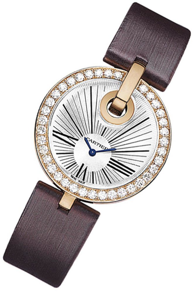 Представляем вашему вниманию, очередную модель женских наручных часов от всемирно известного французского производителя часов и ювелирных изделий Cartier. Название модели Captive de Cartier Large WG600011 которые находятся в коллекции "Captive de Cartier". Сразу хотелось сказать, что часы заинтересуют как и любительниц исключительно женственных, необычных дизайнов, так и любительниц надежных простых устройств. Корпус выполнен в форме круга, отполирован до блеска, сделан из розового восемнадцати-каратного золота, и имеет такие размеры: 35 x 9.33 мм. Основные функции модели это часы, минуты. Кварцевый механизм часов оснащен калибром Cartier 056. Циферблат серебристого цвета, гильошированный. Ремешок часов баклажанового цвета, выполнен из такого материала как атлас, оснащен золотой вставкой также откидной застежкой. На циферблате находятся стрелки, которые отлиты вручную из вороненной стали. И что касается водонепроницаемости, она более стандартна и составляет тридцать метров. Корпус закрывает прочное стекло выполненное из сапфира. Задняя крышка часов закрыта под давлением. Безель украшен белыми бриллиантами, что несомненно оценят любительницы драгоценностей.