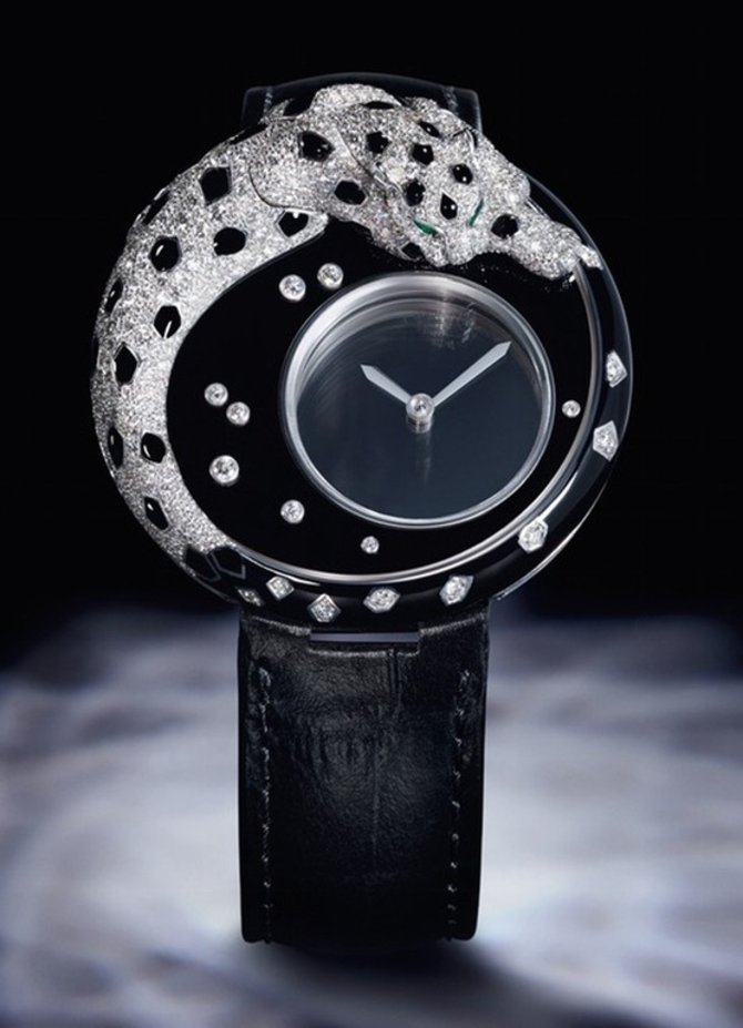 Представленные женские механические часы демонстрируют возможности мастеров бренда Cartier в сфере ювелирного, а также часового мастерства. Корпус часов изготовлен из белого золота и черного лака. На нем расположены 533 белых бриллиантов. Глаза пантеры из зеленых грушевидных изумрудов. Диаметр корпуса - 40 миллиметров. На художественном циферблате с образом пантеры указываются часы и минуты. Водостойкость корпуса - 30 метров. Ремешок из кожи аллигатора - в комплекте. Внутри золотого корпуса размещен механизм с ручным заводом, Калибр 9981 MC.