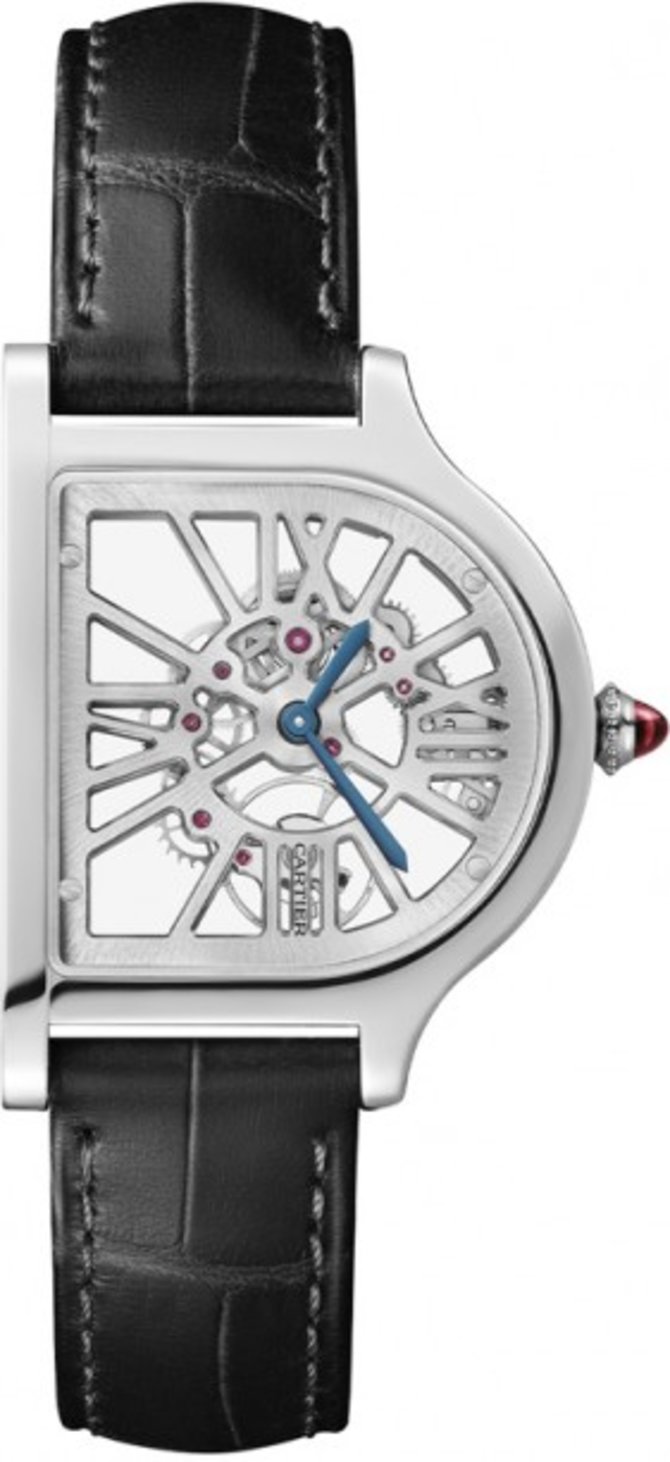 Мужские ювелирные часы Cartier Prive Cloche De Cartier SQ 02 функционируют на базе мануфактурного калибра с ручным подзаводом 9626 MC, что обладает запасом хода на 38 часов работы. Корпус, размером 38.17 х 28.75 мм, выполнен из платины. На полностью скелетонированном циферблате показываются данные часов и минут. В комплекте поставляется ремень из кожи аллигатора черного цвета и застежка из платины. Корпус имеет водонепроницаемость до 30 метров. Часы с обеих сторон закрыты сапфировым стеклом. Лимитированный тираж - 50 экземпляров.