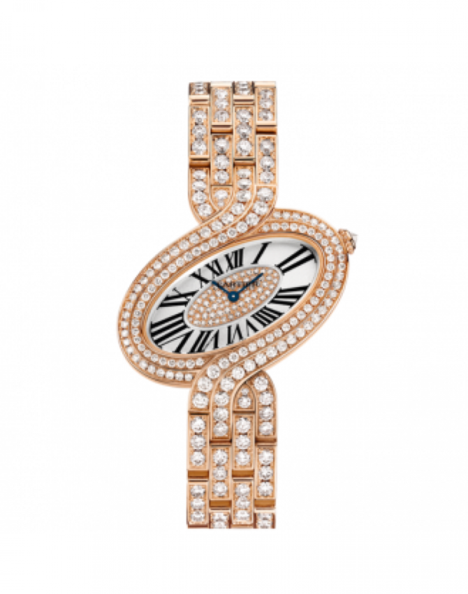 Представляем вашему вниманию, очередную модель женских наручных часов от всемирно известного французского производителя часов и ювелирных изделий Cartier. Название модели Quartz Large HPI00496 которые находятся в коллекции "Delices de Cartier". Сразу хотелось сказать, что часы заинтересуют как и любительниц исключительно женственных, необычных, ушедших от стандартов дизайнов, так и любительниц надежных простых устройств. Корпус выполнен в сложной форме, отполирован до блеска, сделан из розового восемнадцати-каратного золота, и имеет такие размеры: 49.18 х 50.47 х 7.6 мм. Основные функции модели это часы, минуты. Кварцевый механизм часов оснащен калибром Cartier 157. Циферблат серебристого цвета. Браслет часов как и весь корпус выполнен из розового золота, оснащен откидной застежкой, украшен бриллиантами. На циферблате находятся стрелки, которые отлиты вручную из вороненной стали. И что касается водонепроницаемости, она более стандартна и составляет тридцать метров. Корпус закрывает прочное стекло выполненное из сапфира. Задняя крышка часов закрыта под давлением. Безель украшен белыми бриллиантами, что несомненно оценят любительницы драгоценностей.