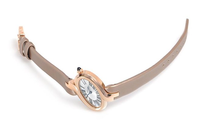 Представляем вашему вниманию, очередную модель женских наручных часов от всемирно известного французского производителя часов и ювелирных изделий Cartier. Название модели Quartz Small W8100009 которые находятся в коллекции "Delices de Cartier". Сразу хотелось сказать, что часы заинтересуют как и любительниц исключительно женственных, необычных, ушедших от стандартов дизайнов, так и любительниц надежных простых устройств. Корпус выполнен в сложной форме, отполирован до блеска, сделан из розового восемнадцати-каратного золота, и имеет такие размеры: 30.78 х 36.07 х 7.2 мм. Основные функции модели это часы, минуты. Кварцевый механизм часов оснащен калибром Cartier 059. Циферблат серебристого цвета. Ремешок часов выполнен из такого материала как атлас, бежевого цвета, оснащен откидной застежкой а также золотой вставкой. На циферблате находятся стрелки, которые отлиты вручную из вороненной стали. И что касается водонепроницаемости, она более стандартна и составляет тридцать метров. Корпус закрывает прочное стекло выполненное из сапфира. Задняя крышка часов закрыта под давлением. Заводной ключ украшен синим сапфиром.