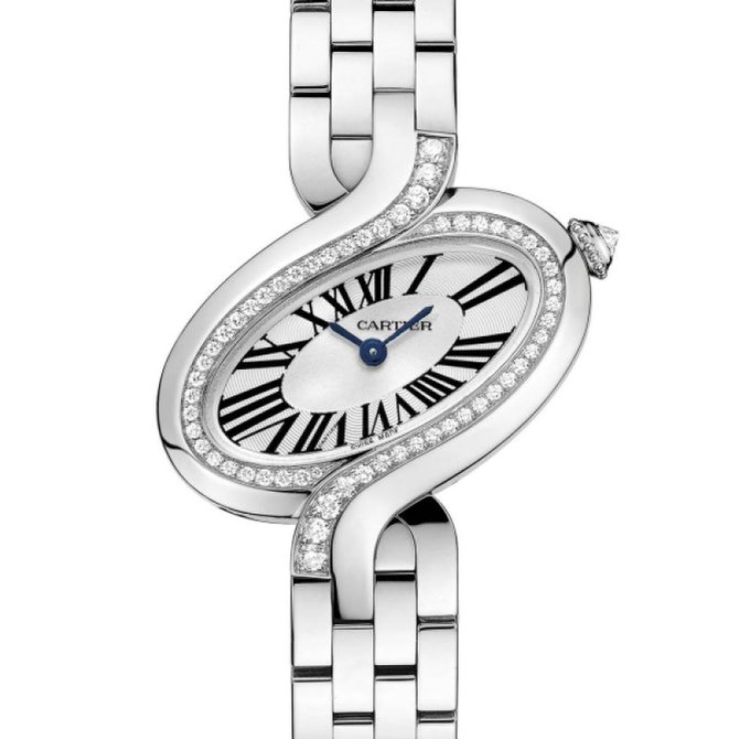 Представляем вашему вниманию, очередную модель женских наручных часов от всемирно известного французского производителя часов и ювелирных изделий Cartier. Название модели Quartz Small WG800004 которые находятся в коллекции "Delices de Cartier". Сразу хотелось сказать, что часы заинтересуют как и любительниц исключительно женственных, необычных, ушедших от стандартов дизайнов, так и любительниц надежных простых устройств. Корпус выполнен в сложной форме, отполирован до блеска, сделан из белого восемнадцати-каратного золота, и имеет такие размеры: 30.78 х 36.07 х 7.2 мм. Основные функции модели это часы, минуты. Кварцевый механизм часов оснащен калибром Cartier 059. Циферблат серебристого цвета. Браслет как и весь корпус, выполнен из белого золота, украшен бриллиантами, оснащен откидной застежкой. На циферблате находятся стрелки, которые отлиты вручную из вороненной стали. И что касается водонепроницаемости, она более стандартна и составляет тридцать метров. Корпус закрывает прочное стекло выполненное из сапфира. Задняя крышка часов закрыта под давлением. Безель украшен белыми бриллиантами, что несомненно оценят любительницы драгоценностей. Заводной ключ украшен белым бриллиантом.