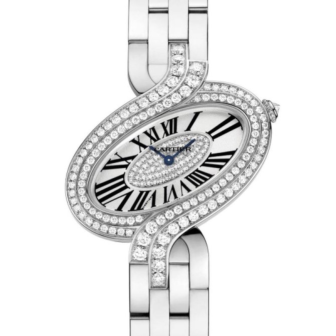 Представляем вашему вниманию, очередную модель женских наручных часов от всемирно известного французского производителя часов и ювелирных изделий Cartier. Название модели Quartz Large WG800009 которые находятся в коллекции "Delices de Cartier". Сразу хотелось сказать, что часы заинтересуют как и любительниц исключительно женственных, необычных, ушедших от стандартов дизайнов, так и любительниц надежных простых устройств. Корпус выполнен в сложной форме, отполирован до блеска, сделан из белого восемнадцати-каратного золота, и имеет такие размеры: 49.18 х 50.47 х 7.6 мм. Основные функции модели это часы, минуты. Кварцевый механизм часов оснащен калибром Cartier 157. Циферблат серебристого цвета. Браслет как и весь корпус, выполнен из рбелого золота, украшен бриллиантами, оснащен откидной застежкой.. На циферблате находятся стрелки, которые отлиты вручную из вороненной стали. И что касается водонепроницаемости, она более стандартна и составляет тридцать метров. Корпус закрывает прочное стекло выполненное из сапфира. Задняя крышка часов закрыта под давлением. Безель украшен белыми бриллиантами, что несомненно оценят любительницы драгоценностей.