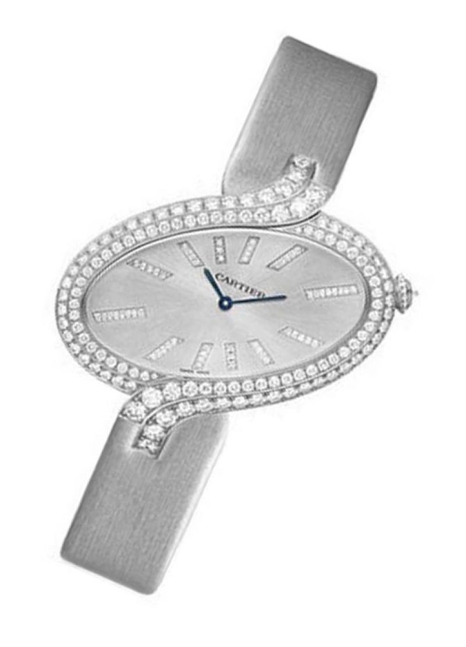 Представляем вашему вниманию, очередную модель женских наручных часов от всемирно известного французского производителя часов и ювелирных изделий Cartier. Название модели Quartz Extra Large WG800021 которые находятся в коллекции "Captive de Cartier". Сразу хотелось сказать, что часы заинтересуют как и любительниц исключительно женственных, необычных, ушедших от стандартов дизайнов, так и любительниц надежных простых устройств. Корпус выполнен в сложной форме, отполирован до блеска, сделан из белого восемнадцати-каратного золота, и имеет такие размеры: 49.18 х 50.47 х 7.6 мм. Основные функции модели это часы, минуты. Кварцевый механизм часов оснащен калибром Cartier 688. Циферблат золотистого цвета. Ремешок часов серого цвета, выполнен из такого материала как атлас, оснащен золотой вставкой также откидной застежкой. На циферблате находятся стрелки, которые отлиты вручную из вороненной стали. И что касается водонепроницаемости, она более стандартна и составляет тридцать метров. Корпус закрывает прочное стекло выполненное из сапфира. Задняя крышка часов закрыта под давлением. Безель украшен белыми бриллиантами, что несомненно оценят любительницы драгоценностей.