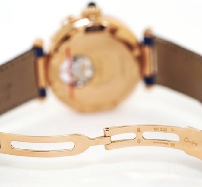 Швейцарские часы унисекс CARTIER PASHA DE CARTIER PRIVEE TOURBILLON 2578 были выпущены лимитированным тиражом в 25 экземпляров. Модель в идеальном состоянии с полной комплектацией - коробкой и документами. Круглый корпус выполнен из розового золота в размере 38 мм. В нем расположен механический калибр с автоматическим подзаводом 492 MC, запасом хода на 50 часов работы, а также функцией турбийона, что служит для нивелирования влияния земной гравитации на точность хода. Под сапфировым стеклом на циферблате показываются данные текущего времени и расположено окошко турбийона. Модель укомплектована ремнем из кожи аллигатора и фирменной золотой застежкой. Водонепроницаемость корпуса составляет 30 метров.