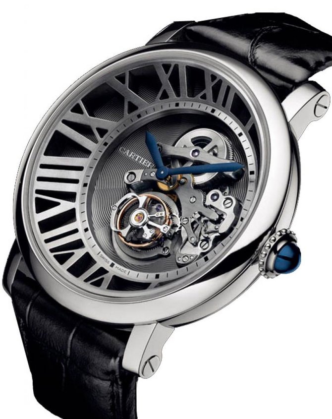 Пришло время ознакомиться со следующей моделью мужских наручных часов от всемирно известного французского производителя часов и ювелирных изделий Cartier. Название модели Reversed Tourbillon W1556214 которые находятся в коллекции Rotonde de Cartier. Сразу хотелось сказать, что часы заинтересуют как и любителей строгих дизайнов, так и любителей надежных простых, функциональных устройств. Круглый корпус, отполирован до блеска, сделан из белого восемнадцати каратного золота, и имеет такие размеры: 46.2 х 12.75 мм. Основные функции модели это часы, минуты. И сразу обращаем внимание на главные особенности этой модели это турбийон, каретка которого находится на позиции центра, смещенная в сторону трех часов. Механизм с ручным заводом оснащен калибром Cartier 9458 MC. Циферблат серебристого цвета, гильошированный. Ремешок черного цвета выполнен из кожи аллигатора, оснащен вставкой из золота. И что касается водонепроницаемости, она более стандартна и составляет тридцать метров. Заводной ключ инкрустирован синим бриллиантом. Корпус закрывает прочное стекло выполненное из сапфира. Благодаря задней прозрачной крышке, можно наблюдать за работой механизма. Запас хода модели равен пятидесяти часам. Серия модели ограничена всего лишь в 100 экземпляров.