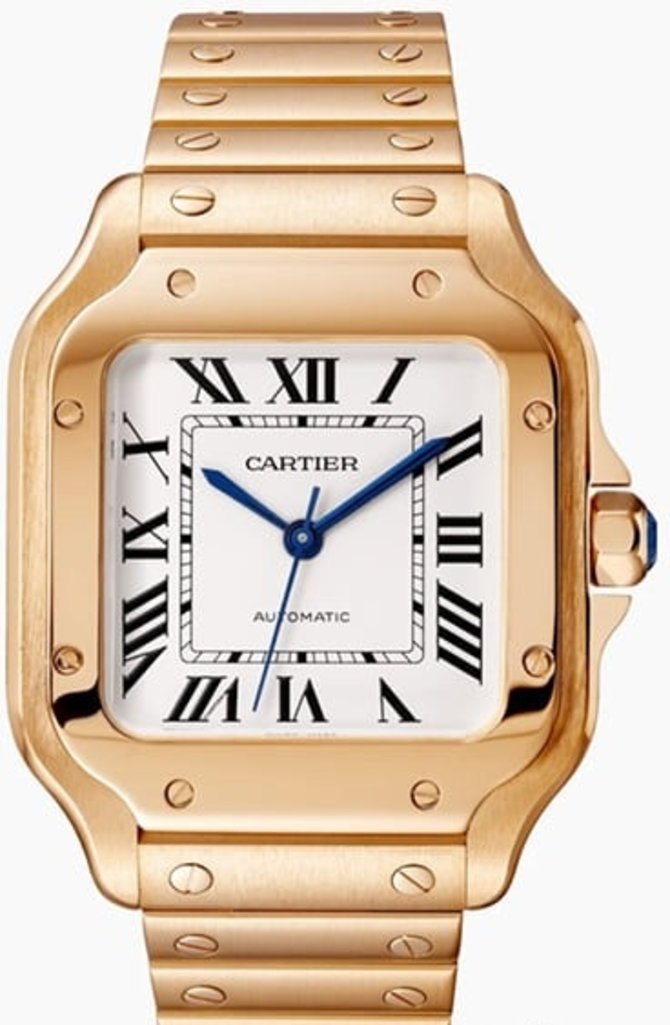 Швейцарские часы от часовой компании CARTIER, модель Santos de Cartier Santos Medium 35 mm WGSA0031, вошли в коллекцию Santos De Cartier. Модель выпущена в корпусе из розового золота, размером 35.1 х 8.83 мм. Установленный мануфактурный автоматический калибр 1847 MC обеспечивает индикацию часов, минут и секунд воронеными стрелками синего цвета, указывающими на римскую часовую разметку. Циферблат белого цвета с сатинированной отделкой накрыт стеклом из сапфирового кристалла. В комплекте - золотой браслет с раскладной пряжкой. Уровень герметичности корпуса - 100 метров. Часы выпущены брендом CARTIER в 2021 году.