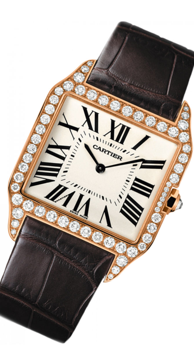 Пришло время ознакомиться со следующей моделью мужских наручных часов от всемирно известного французского производителя часов и ювелирных изделий Cartier. Название модели Santos-Dumont Large WH100751 которые находятся в коллекции Santos de Cartier. Сразу хотелось сказать, что часы заинтересуют как и любителей строгих дизайнов, так и любителей надежных простых устройств. Корпус квадратной формы, отполирован до блеска, сделан из розового восемнадцати каратного золота, и имеет такие размеры: 44.6 x 34.6 x 5.58 мм. Основные функции модели это часы, минуты. Механизм с ручным заводом оснащен калибром Cartier 430 MC. Циферблат серебристого цвета. Ремешок коричневого цвета выполнен из кожи аллигатора, оснащен вставкой из розового золота а также откидной застежкой. На циферблате находятся стрелки, которые отлиты вручную. И что касается водонепроницаемости, она более стандартна и составляет тридцать метров. Заводной ключ инкрустирован синей шпинелью. Корпус закрывает прочное стекло выполненное из сапфира. Задняя крышка часов закрыта под давлением. Запас хода модели составляет семьдесят два часа. Любители драгоценностей оценят модель несомненно, так как корпус украшен белыми бриллиантами.