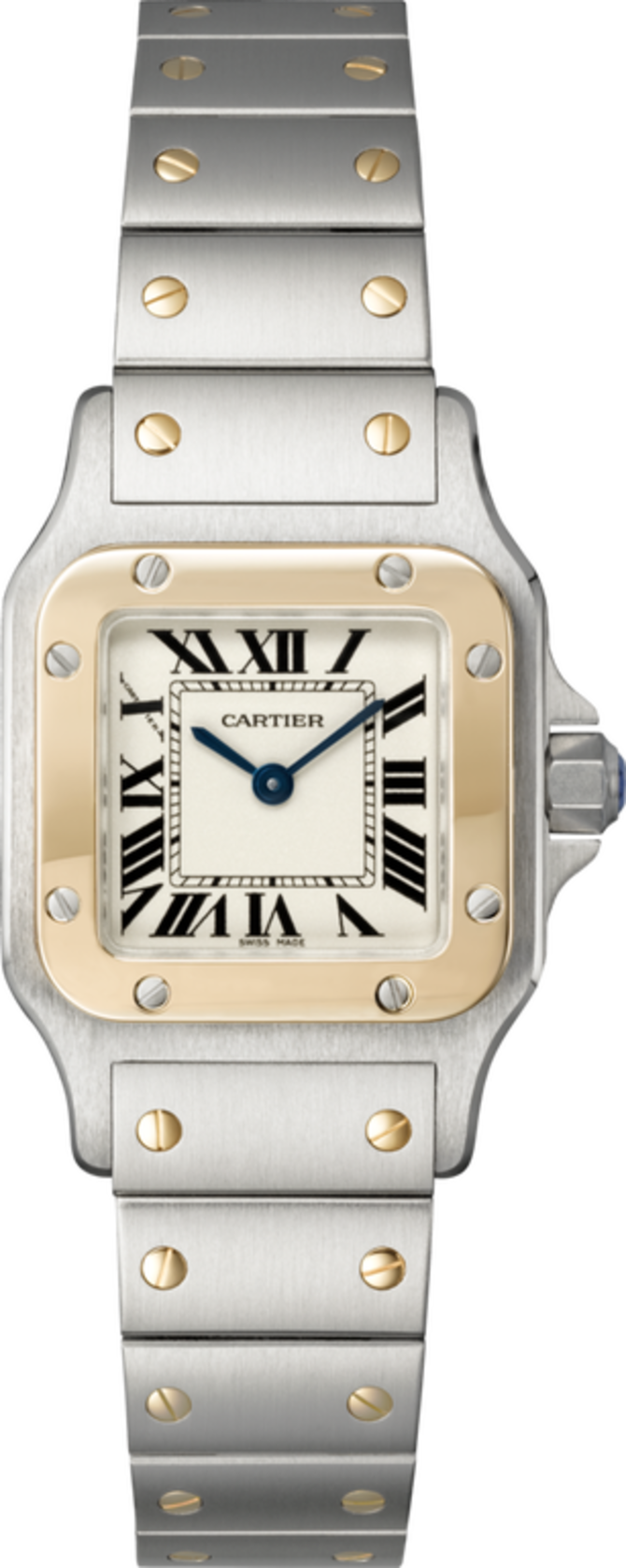 Квадратный корпус, размером 34.8 мм x 26.2 мм, изготовлен из комбинации желтого золота и стали. Циферблат с синими воронеными стальными стрелками служит для отображения данных часов и минут. Лицевая часть корпуса закрыта стеклом из сапфирового кристалла. Браслет, что в комплекте, Выполнен из стали с золотыми вставками. Мануфактурный кварцевый механизм установлен для обеспечения индикации текущего времени. Водонепроницаемость корпуса - 30 метров.
