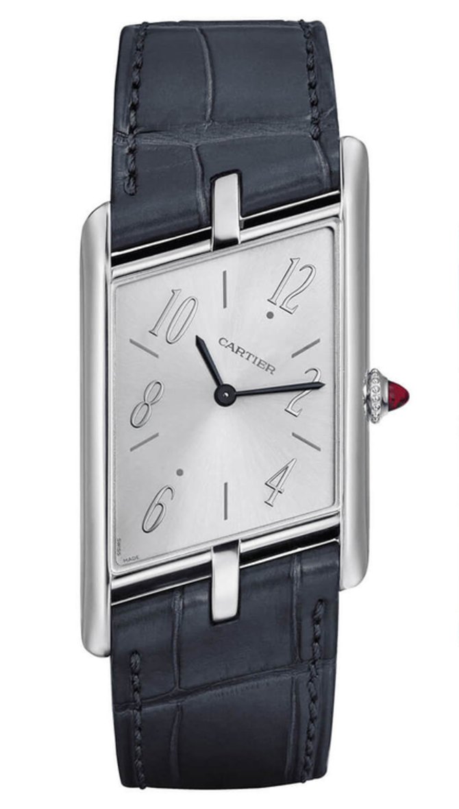 Модель мужских наручных часов CARTIER WGTA0042 Tank Asymétrique представлена в прямоугольном корпусе из натуральной платины. Циферблат накрывает прочное сапфировое стекло. Механический калибр 1917 MC имеет запас хода на 38 часов. Водонепроницаемость данной модели составляет 30 метров. Ремешок часов выполнен из кожи аллигатора и оснащен вставкой из платины. Функции часов: часы, минуты. Модель была выпущена в 2020 году ограниченным тиражом 100 экземпляров. Заводная головка украшена драгоценным камнем - красным рубином.