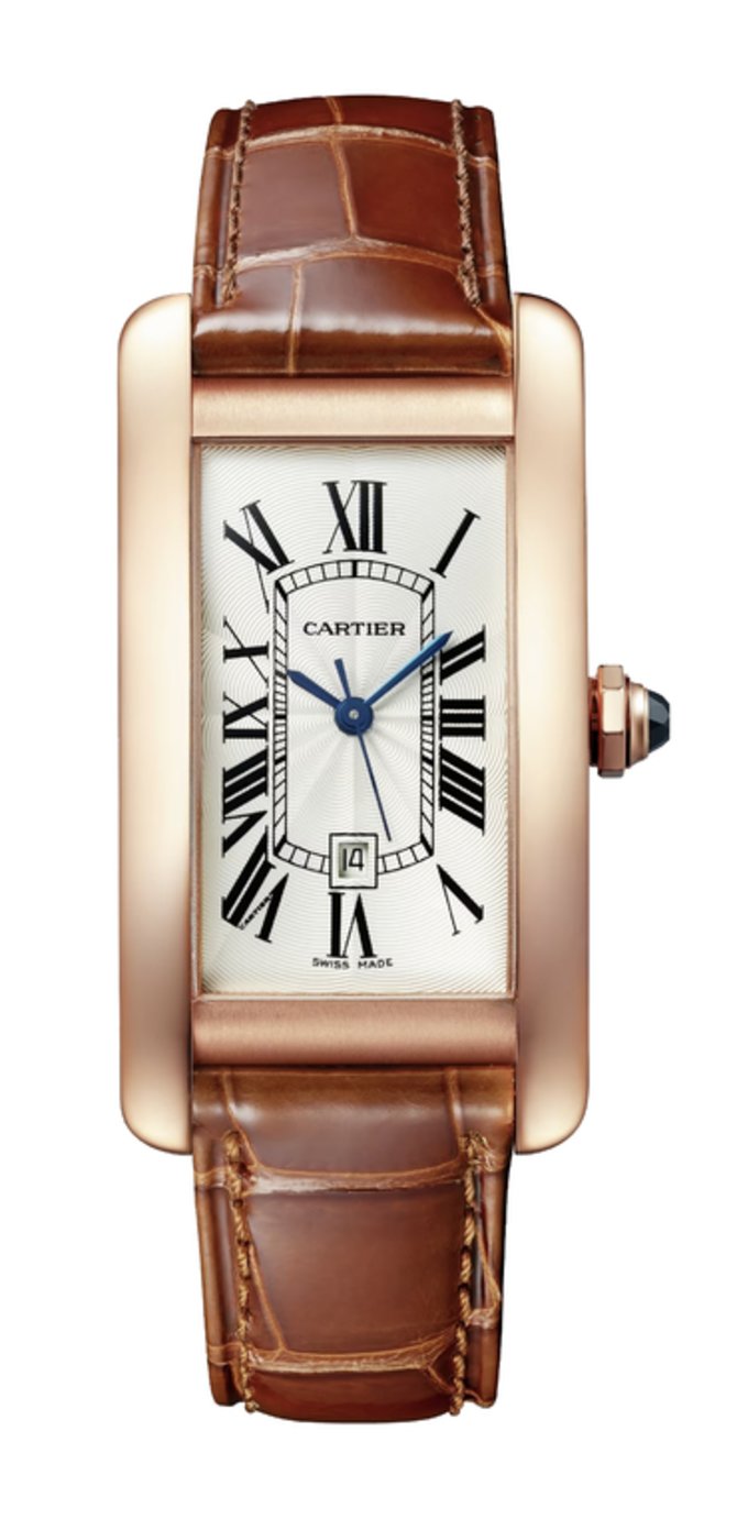 Швейцарская часовая компания Cartier представляет наручные часы Tank WGTA0046 Américaine в прямоугольном корпусе из розового золота, диаметром 41.60 мм x 22.60 мм. Циферблат служит для индикации часов и минут. Защита циферблата обеспечена сапфировым стеклом с антибликовым покрытием. Мануфактурный механический калибр с автоподзаводом. Ремень из коричневой кожи аллигатора оснащен застежкой из золота. Водонепроницаемость корпуса рассчитана на 30 метров.