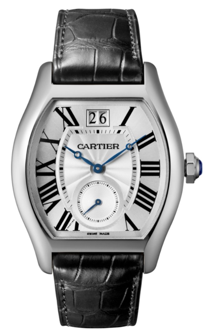 Швейцарские классические наручные часы, разработанные французской компанией Cartier, обладают так называемым функциональным джентльменским набором - индикацией часов, минут, секунд и даты. Данный функциональный ряд является самым необходимым и практичным как для часов, используемых ежедневно. Бочкообразный корпус модели выполнен из белого золота (18-каратного). Диаметр корпуса - 38 х 48 мм, толщина - 14.5 мм. Гильошированный вручную в стенах мануфактуры циферблат накрывается сапфировым стеклом. Стрелки сделаны из вороненой стали. Индикатор даты накрыт увеличивающим стеклом. Заводная головка украшена сапфиром-кабошоном синего цвета.