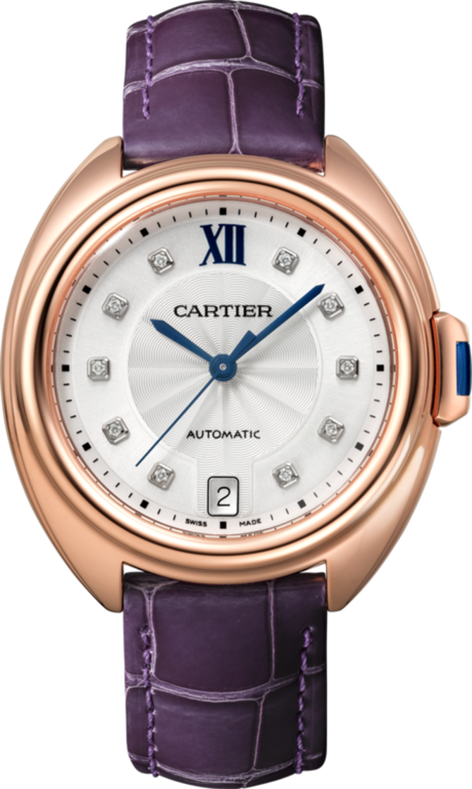 Ювелирные часы с часовыми метками из белых бриллиантов классической огранки - это модель CLÉ DE CARTIER 35 MM 18K PINK GOLD LEATHER DIAMONDS. Вручную полированный корпус наручных часов изготовлен из чистого 18-каратного золота, диаметром 35 мм. Воронеными стрелками из стали показывается текущее время, а дата указывается на индикаторе внизу, возле отметки "6 часов". Стекло, которым производитель накрыл циферблат от повреждений, сделано из сапфирового кристалла и сверху покрыто антибликовым составом. На руке женская модель швейцарских часов фиксируется ремешком из кожи аллигатора фиолетового цвета.