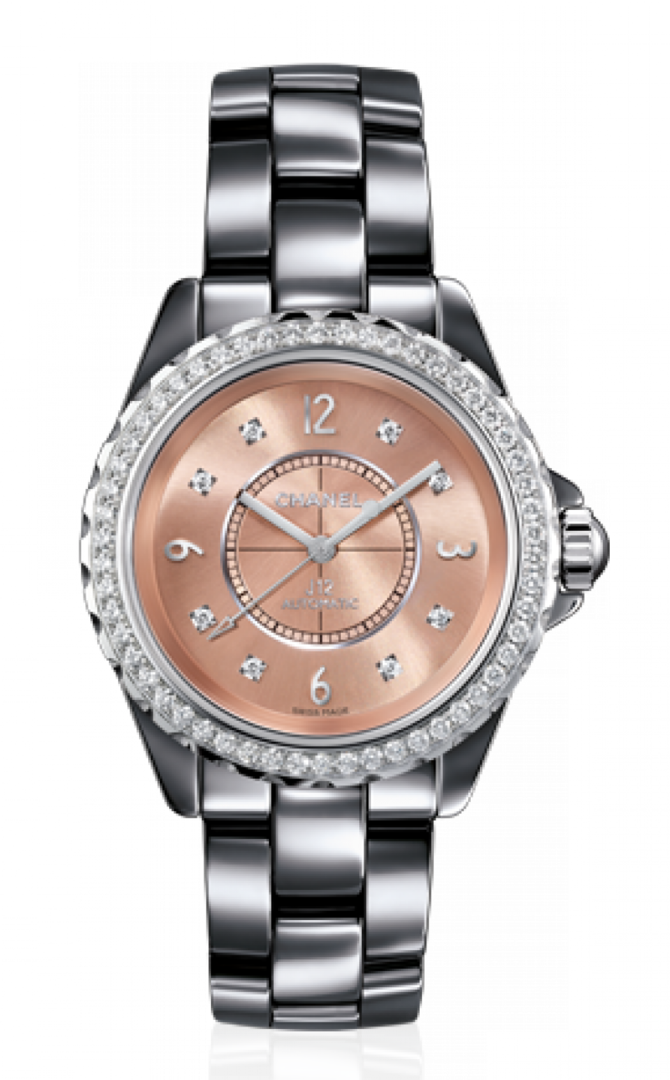 Известная на весь мир швейцарская компания Chanel, которая специализируется на изготовлении великолепных часов, а также ювелирных изделий, представляет Вашему вниманию очередную модель женских наручных часов Chanel J12 J12 Chromatic Diamond 38 mm H2564 из коллекции Chanel J12. Данная модель будет интересна любительницам необычных дизайнов, подчеркивающие классический стиль а также функциональных устройств. Корпус круглой формы отполирован до блеска, выполнен из керамики а также титана, его размер составляет 33 мм в диаметре. Основные функции часов это часы, минуты, секунды. Механизм часов -автоматический, имеет запас хода на 42 часа. Циферблат часов бежевого цвета, украшен белыми бриллиантами. Браслет часов серого цвета, выполнен из керамики, оснащен откидной застежкой. Стрелки которые находятся на циферблате, отлиты вручную из вороненной стали. Прочное сапфировое стекло закрывает корпус, а задняя крышка находится под давлением. Водонепроницаемость модели составляет 50 метров. Заводной ключ находится на позиции трех часов. Безель украшен белыми бриллиантами, что несомненно оценят любительницы драгоценностей.