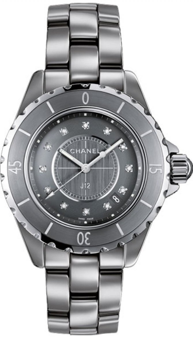 Известная на весь мир швейцарская компания Chanel, которая специализируется на изготовлении великолепных часов, а также ювелирных изделий, представляет Вашему вниманию очередную модель женских наручных часов Chanel J12 J12 Chromatic Titan 38 mm H3242 из коллекции Chanel J12. Данная модель будет интересна любительницам необычных дизайнов, подчеркивающие классический стиль а также функциональных устройств. Корпус круглой формы отполирован до блеска, выполнен из керамики а также титана, его размер составляет 38 мм в диаметре. Основные функции часов это часы, минуты, секунды, дата. Механизм часов автоматический, имеет запас хода на 42 часа. Циферблат часов серого цвета, гильошированный, украшен белыми бриллиантами. Браслет часов серого цвета, выполнен из титана, оснащен откидной застежкой. Стрелки которые находятся на циферблате, отлиты вручную из вороненной стали. Прочное сапфировое стекло закрывает корпус, а задняя крышка находится под давлением. Водонепроницаемость модели составляет 200 метров. Заводной ключ находится на позиции трех часов.