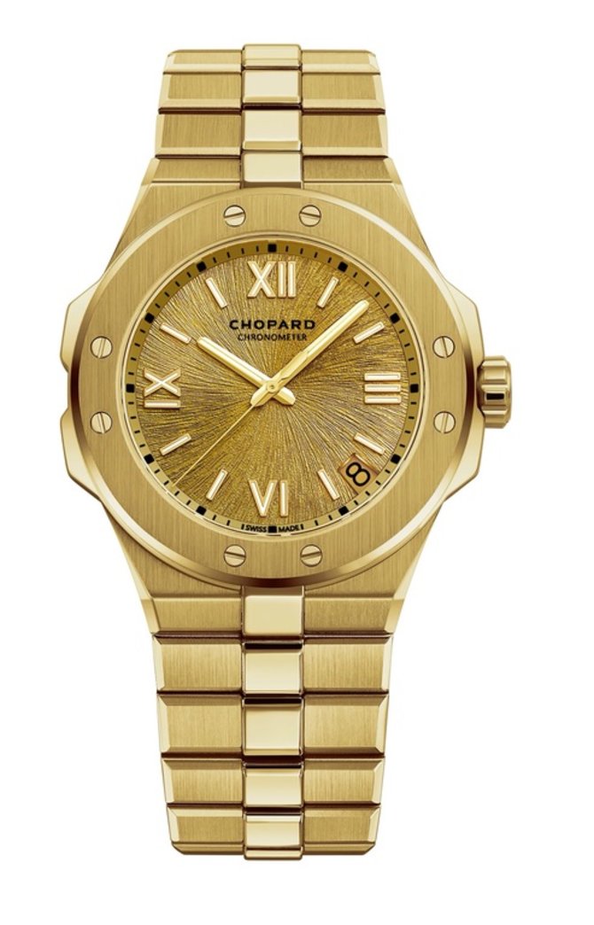 Компания Chopard выпустила новинку – Alpine Eagle 41, ref:295363-0001. Главными отличиями модели являются материал корпуса и браслета – желтое золото 750 пробы и золотой циферблат, украшенный узором, золотые стрелки. Диаметр корпуса 41 мм, задняя крышка – прозрачная, изготовлена из сапфирового кристалла. Водонепроницаемость 100 метров. Внутри находится автоматический мануфактурный механизм CHOPARD 01.01-C, который работает с частотой 28800 полуколебаний в час (4 Гц). Диаметр механизма 28.8 мм. Запас хода 60 часов. Гибкий, эргономичный браслет из желтого золота. Раскладная застежка из желтого и белого золота.