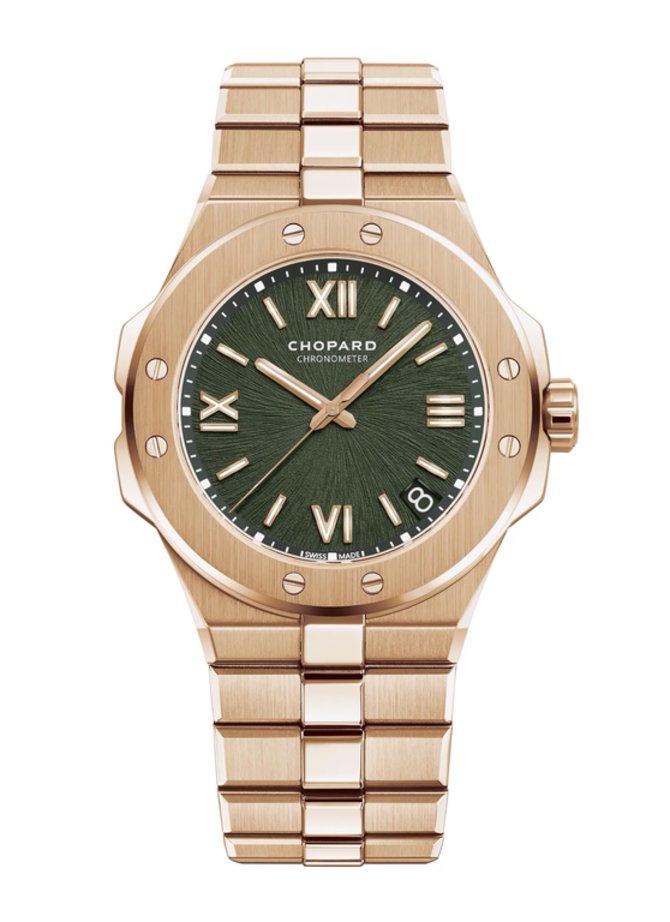 Невероятная новинка от компании Chopard – Alpine Eagle 41mm 295363-5007. Это часы, диаметром 41 мм, оснащенные функциями индикации времени и даты, работающие на основе высокочастотного автоматического механизма с частотой 8 Гц. Материалом корпуса и браслета послужило розовое золото. На верхней части корпуса закреплен круглый золотой безель с восемью винтами. Водонепроницаемость корпуса до глубины 100 метров. Циферблат с сосново-зеленым покрытием защищен сапфировым стеклом. Накладные римские цифры покрыты люминесцентным покрытием Super-LumiNova. Модель оснащена автоматическим мануфактурным механизмом (калибр Chopard 01.01-C), отличающимся функцией остановки секундной стрелки и 60-часовым запасом хода.