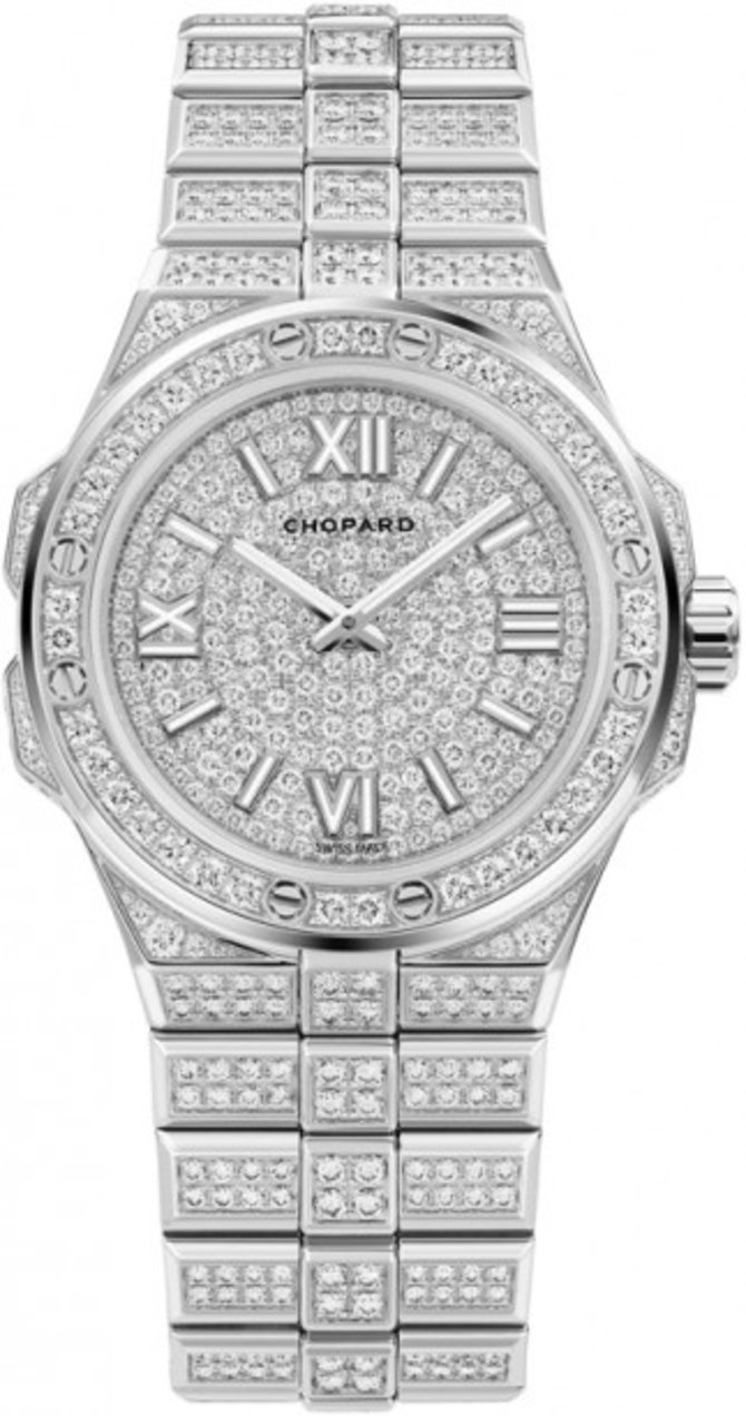 Ювелирные швейцарские часы Alpine Eagle Automatic 36 mm 295370-1001 от часовой мануфактуры Chopard представлены в корпусе из белого 18-каратного золота, диаметром 36 мм, с инкрустацией бриллиантами классической огранки белого цвета. На бриллиантовом циферблате показываются данные часов, минут и секунд стрелками из белого золота, что указывают на часовую разметку из белого золота с люминесцентным составом. Браслет выполнен из белого золота, украшен бриллиантами и оснащен золотой застежкой. Герметичность корпуса рассчитана на 100 метров. Стекло выполнено из сапфирового кристалла. Год выпуска - 2021.