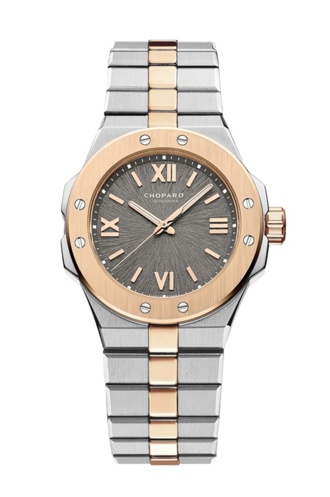 Линейка часов Alpine Eagle от компании Chopard пополнилась новинкой в корпусе, диаметром 33 мм - моделью Alpine Eagle 298617-6001. Отличительной особенностью этой модели является материал корпуса и браслета, а также циферблат. Часы изготовлены из нержавеющей стали в комбинации с розовым золотом. Фиксированный безель, центральный ряд звеньев браслета и головка из розового золота 18 карат. Циферблат серого цвета имеет текстуру с узором в виде солнечных лучей, что напоминает радужную оболочку орлиного глаза. Часовые метки и стрелки изготовлены из розового золота и покрыты люминесцентным составом. Внутри корпуса находится автоматический мануфактурный калибр Chopard 09.01-C. Запас хода 42 часа. Функции: часы, минуты и секунды. Водостойкость 50 метров.