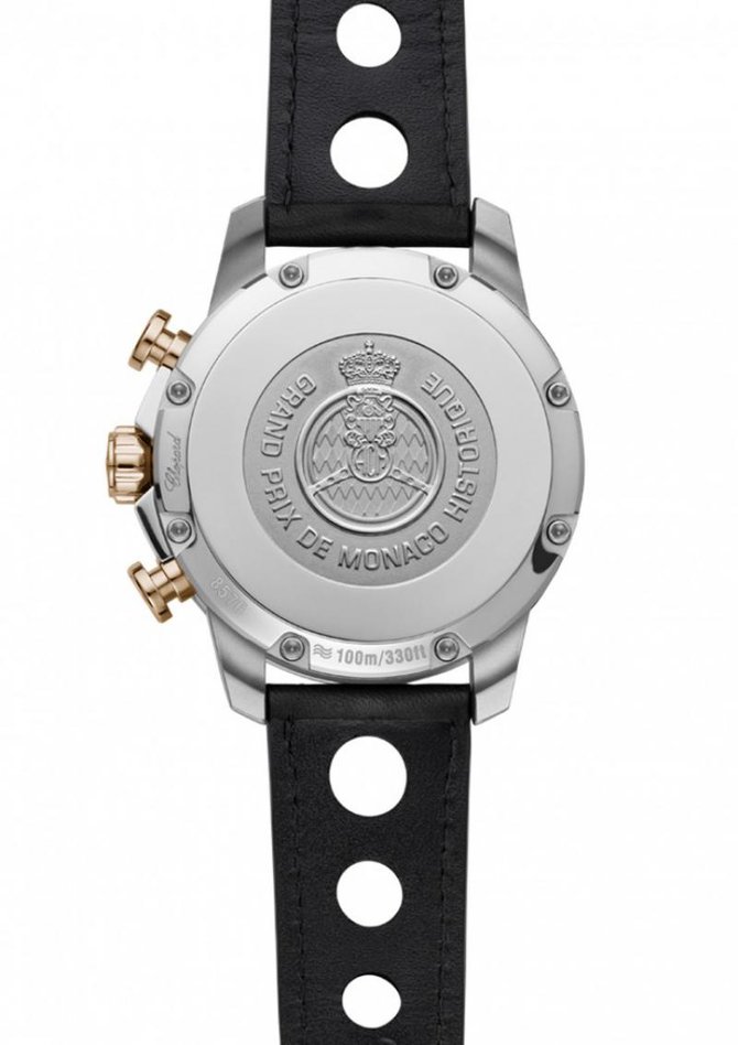 Новинка швейцарских часов от компании Chopard - модель G.P.M.H. Chrono с функцией хронографа. На циферблате отображаются часы и минуты, секунды, дата, хронограф (30-минутный счетчик, 12-часовой счетчик). Компания может похвастаться сертификатом COSC. Подзавод часов автоматический, частота - 4 Гц, запас хода - 46 часов. Корпус модели комбинированный, выполнен из качественной нержавеющей стали, розового золота и титана. На циферблат со спиральной отделкой нанесено люминесцентное покрытие (часовые метки и стрелки), что позволяет следить за временем даже в темноте. Стекло модели антибликовое, сапфировое, устойчивое к царапинам. Механизм защищен 100-метровой водонепроницаемостью. Модель комплектуется ремешком из телячьей кожи с раскладной титановой застежкой.