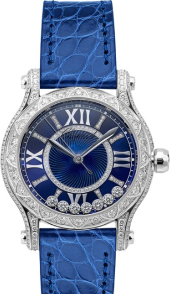 Специалисты бренда Chopard начиная с 1993 года успешно смешивают жанры и стили, сталь и бриллианты, вечность и эфемерность. Оригинальность и авангардное видение. Изысканность и в тоже время спортивность. И речь пошла о сегодняшней модели - Happy Sport Joaillerie. Они вызывают чувство радости, примеряет различные образы, сохраняя исключительную женственность. Начнём с корпуса, он состоит из 18-каратного белого золота, диаметр которого составляет 36 мм. Безель и все остальные части корпуса инкрустированы драгоценными камнями. Синий гильошированный циферблат покрытий белыми брилиантами защищает сапфировое стекло с антибликовым напылением. Стрелки как и корпус из 18-кратного белого золота. Часы поставляются с ремешком из кожи аллигатора с вставкой из 18-каратного белого золота. Сердце данной модели является автоматический механизм, которого хватит на 42 часа. Серия ограничена (25 шт.). Год выхода модели 2020.