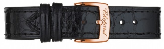 Компания Chopard, завоевавшая во всем мире имидж качественных швейцарских часов, представляет модель наручных часов в круглом 30-миллиметровом корпусе из розового золота, искусно декорированном белыми бриллиантами. Точнее, инкрустирован драгоценными камнями безель корпуса. Под защитным сапфировым стеклом с антибликовым покрытием, кроме золотых часовых меток и золотых стрелок для индикации данных, находятся 5 настоящих белых бриллиантов. Автоматический механический калибр гарантирует индикацию текущего времени. На руке модель крепится элегантным ремешком из натуральной кожи крокодила черного цвета. Ремешок дополнен классической застежкой из золота с гравировкой названия бренда. Корпус обладает 30-метровой водонепроницаемостью. К тому же, кроме лицевого сапфирового стекла, на часах размещено еще одно - в виде задней крышки, которая открывает замечательный вид на работу механизма.