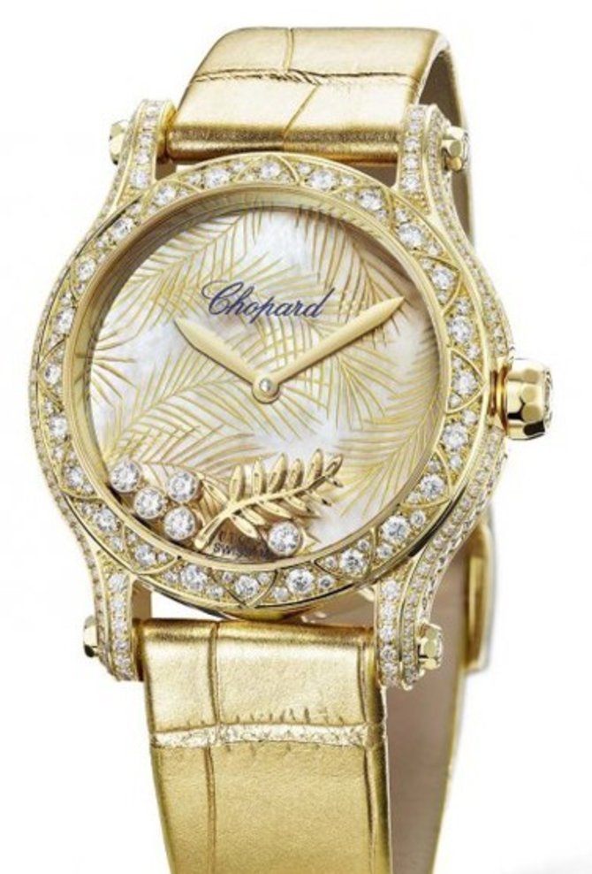 Мануфактура из Швейцарии Chopard выпустила часы механического типа Happy Sport Happy Palm 275366-0001, корпус которых из желтого золота украшен белыми бриллиантами классической огранки. Размер корпуса - 36 х 12.09 мм. Герметичность корпуса наручных часов - 30 метров. Антибликовое стекло из сапфирового кристалла защищает циферблат, украшенный драгоценными камнями и золотой ветвью пальмы. Стрелки выполнены из желтого золота. Золотистый ремешок пошит из кожи аллигатора и дополнен застежкой из желтого золота. Установленный автоматический калибр L.U.C 96.23-L гарантирует индикацию текущего времени в часах и минутах. Лимитированная серия - 25 экземпляров.