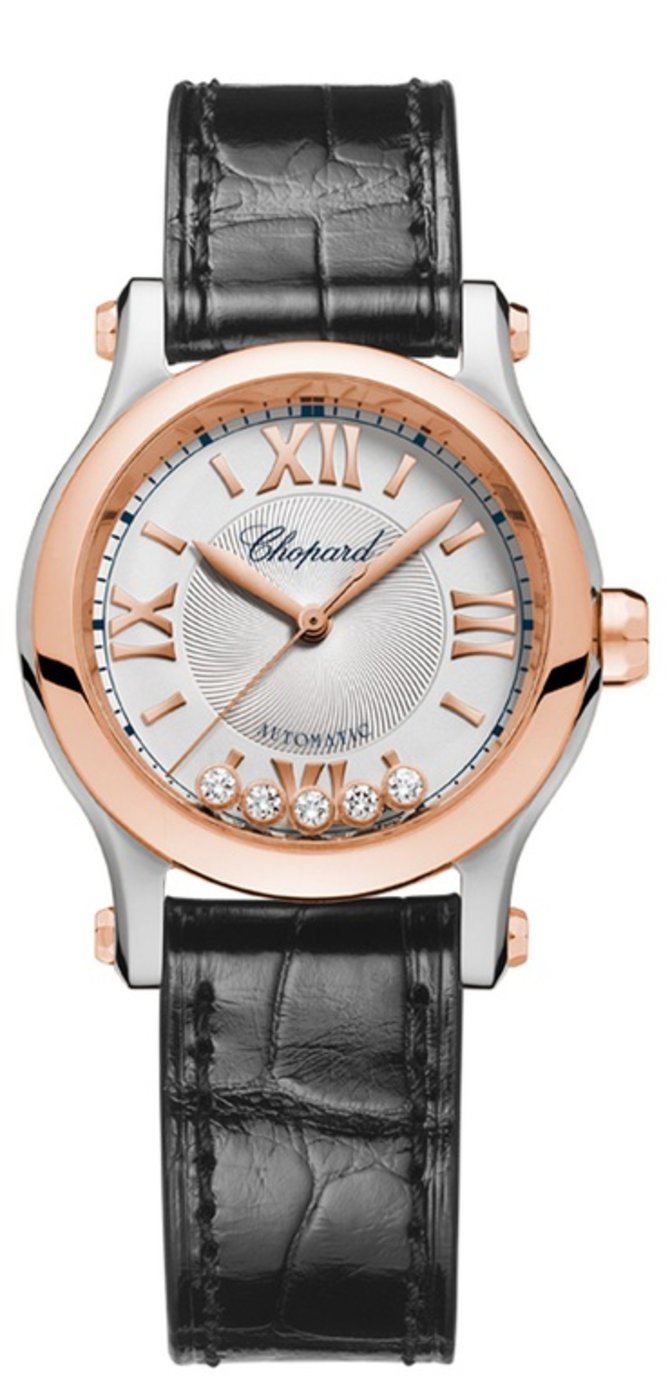 Компания Chopard, завоевавшая во всем мире имидж качественных швейцарских часов, представляет модель наручных часов в круглом 30-миллиметровом корпусе из нержавеющей стали и розового золота. Под защитным сапфировым стеклом с антибликовым покрытием, кроме золотых часовых меток и золотых стрелок для индикации данных, находятся 5 настоящих белых бриллиантов. Автоматический механический калибр гарантирует индикацию текущего времени. На руке модель крепится элегантным ремешком из натуральной кожи крокодила черного цвета. Ремешок дополнен классической застежкой из золота с гравировкой названия бренда. Корпус обладает 30-метровой водонепроницаемостью. К тому же, кроме лицевого сапфирового стекла, на часах размещено еще одно - в виде задней крышки, которая открывает замечательный вид на работу механизма.