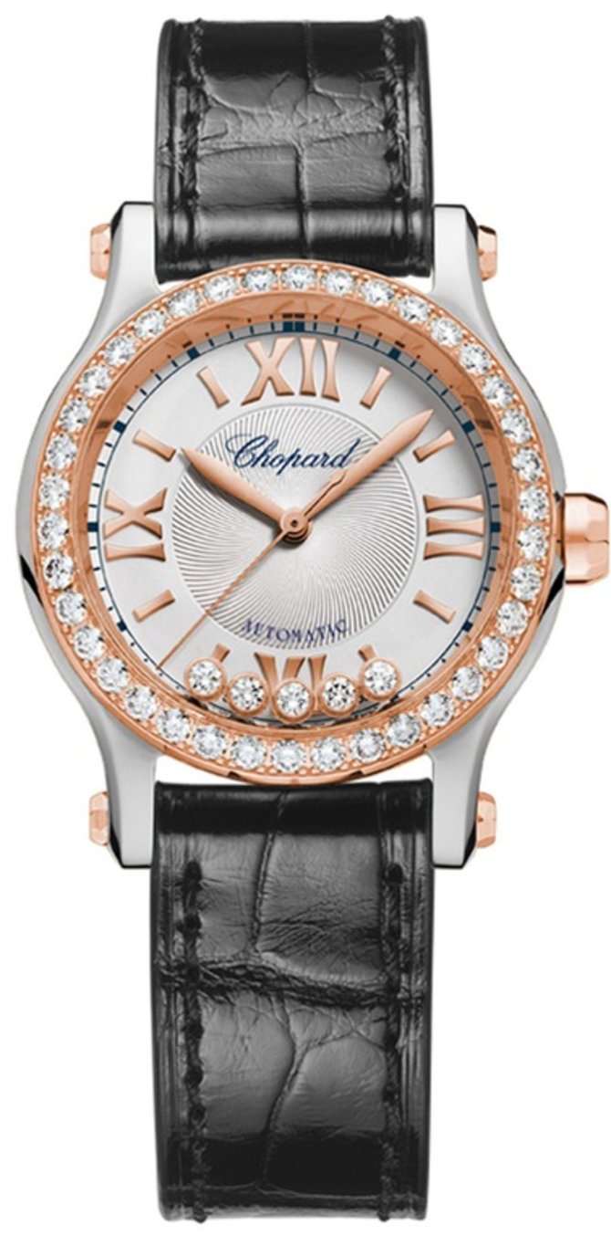 Компания Chopard, завоевавшая во всем мире имидж качественных швейцарских часов, представляет модель наручных часов в круглом 30-миллиметровом корпусе из розового золота и стали, искусно декорированном белыми бриллиантами. Точнее, инкрустирован драгоценными камнями безель корпуса. Под защитным сапфировым стеклом с антибликовым покрытием, кроме золотых часовых меток и золотых стрелок для индикации данных, находятся 5 настоящих белых бриллиантов. Автоматический механический калибр гарантирует индикацию текущего времени. На руке модель крепится элегантным ремешком из натуральной кожи крокодила черного цвета. Ремешок дополнен классической застежкой с гравировкой названия бренда. Корпус обладает 30-метровой водонепроницаемостью. К тому же, кроме лицевого сапфирового стекла, на часах размещено еще одно - в виде задней крышки, которая открывает замечательный вид на работу механизма.