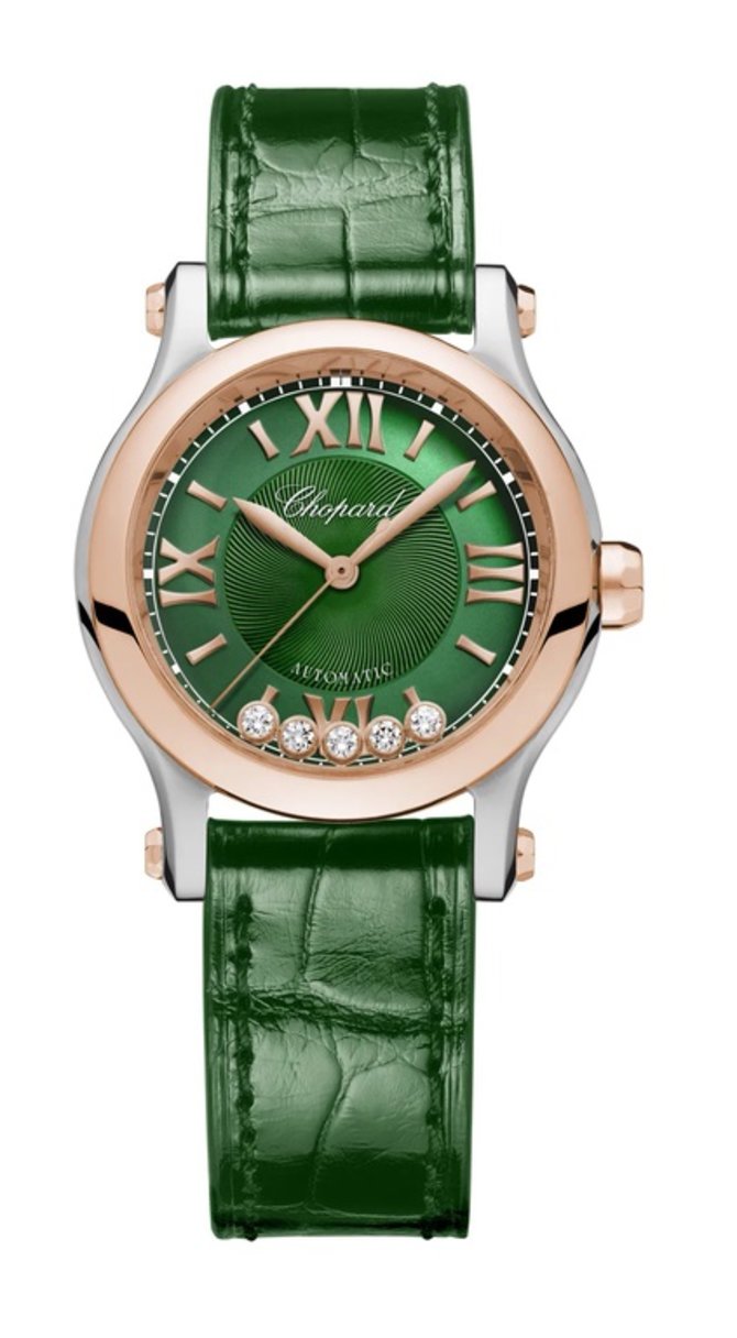 Швейцарские наручные часы Chopard Happy Sport Automatic 30 мм 278573-6032, диаметром 30 мм - настоящее воплощение роскоши и стиля. Часы с потрясающим зеленым циферблатом украшены пятью подвижными бриллиантами. Часовые метки в виде римских цифр, выполненных из золота. Корпус изготовлен из 18-каратного розового золота и нержавеющей стали. Модель оснащена надежным автоматическим калибром CHOPARD 09.01-C. Запас хода 42 часа. Стекло из сапфирового кристалла с противобликовым составом. Водостойкость корпуса - 30 метров.