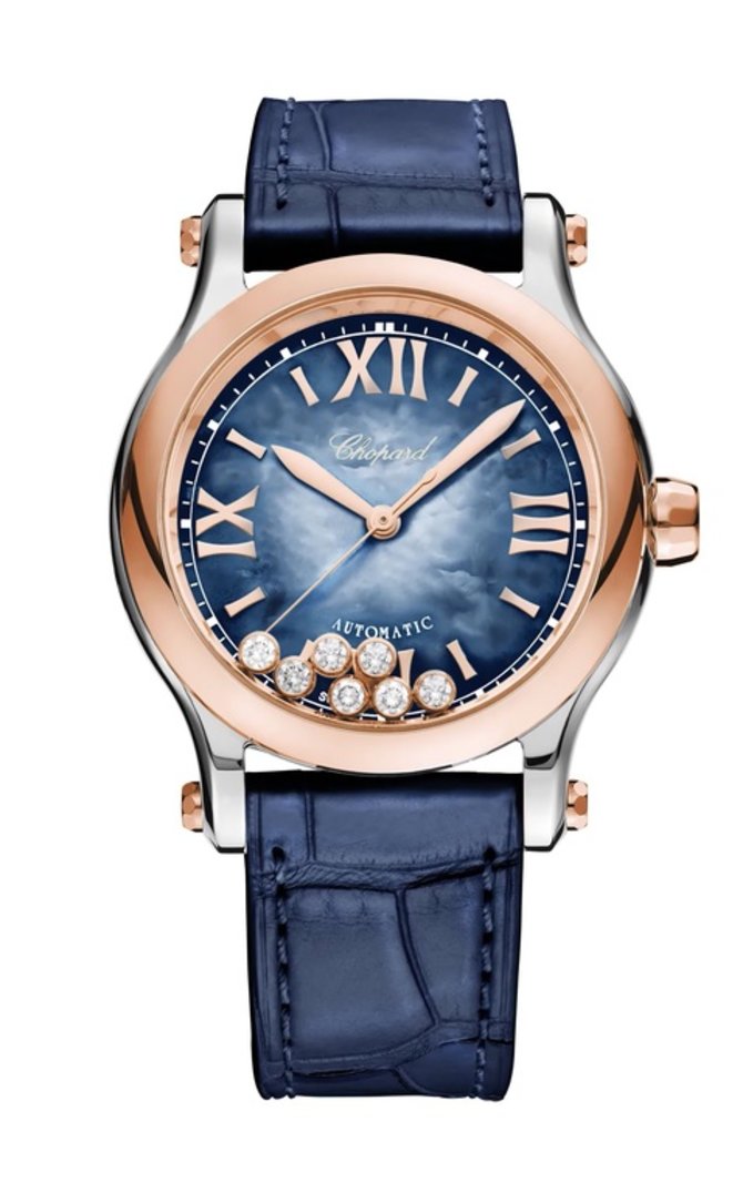 Швейцарские часы от Chopard - Happy Sport ref: 278578-6003 с корпусом, диаметром 36 мм, из стали и розового золота оснащены надежным автоматическим механизмом, обеспечивающим точность хронометража. Модель сочетает в себе розовое золото, нержавеющую сталь и блестящие плавающие бриллианты (7 штук, общий вес 0,35 карата). Синий ремешок из кожи аллигатора поставляется с классической застежкой из стали. Как и все часы Chopard, модель Happy Sport создана в соответствии с высокими стандартами качества и мастерства. Для защиты циферблата от повреждений производитель установил стекло из натурального сапфирового кристалла с антибликовыми свойствами. Герметичность корпуса составляет 30 метров.