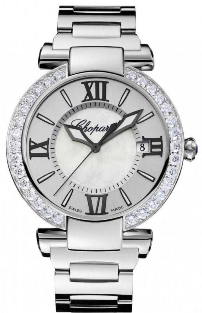 Часы Imperiale Automatic 40 mm - классическая модель с автоматическим механизмом, запас хода 60 часов, функции: часы, минуты, секунды и дата. Время отображается на серебристом циферблате с помощью трех центральных стрелок, дата расположена на уровне 3-х часов. Корпус часов изготовлен из нержавеющей стали, его размер 40 х 10.28 мм. Водонепроницаемость корпуса до 50 метров. Часы комплектуются браслетом из нержавеющей стали. Безель из белых бриллиантов.