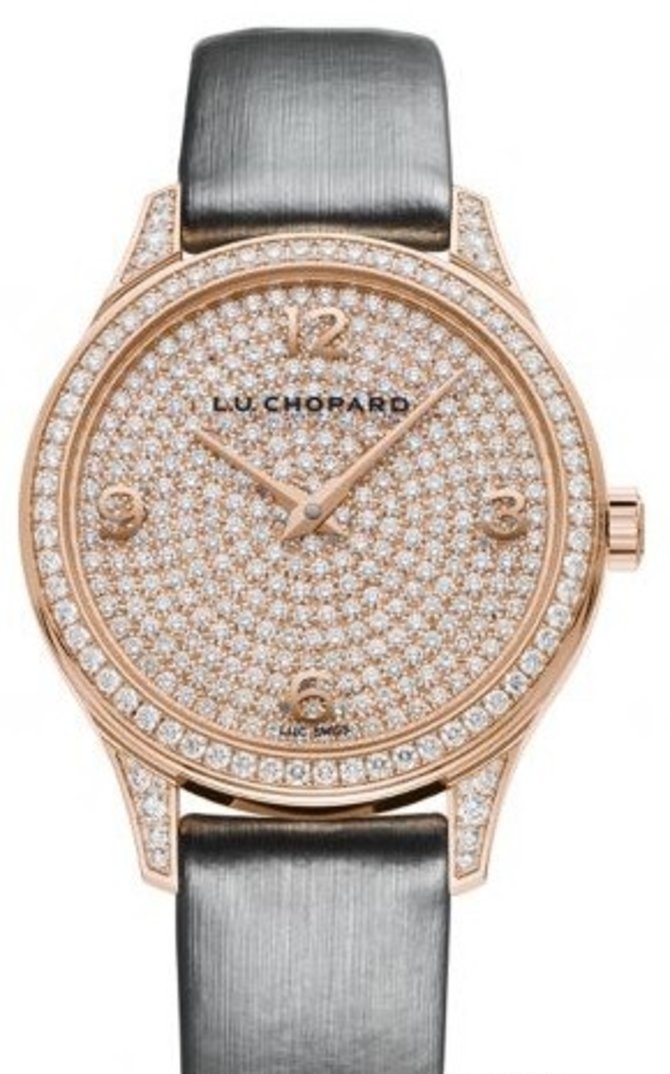 Швейцарский часовой бренд Chopard представляет ювелирную модель L.U.C XP 35 mm 131972-5001 со статусом сверхточного хронометра от швейцарского института хронометрии COSC. Круглый корпус из розового золота, а также и весь циферблат украшен белыми бриллиантами классической огранки, установленными вручную ювелирами швейцарской мануфактуры Chopard. Циферблат защищается сапфировым стеклом с противобликовым эффектом. Часовая и минутная стрелки, а также цифры на циферблате выполнены из розового золота. Ремешок сатиновый черного цвета укомплектован классической вставкой из розового золота. Автоматический калибр 96.17-L мануфактурной разработки инженеров Chopard имеет 65-часовой запас хода. Герметичность корпуса - 30 метров. Год выпуска ювелирных часов Chopard L.U.C XP 35 mm 131972-5001 - 2019.