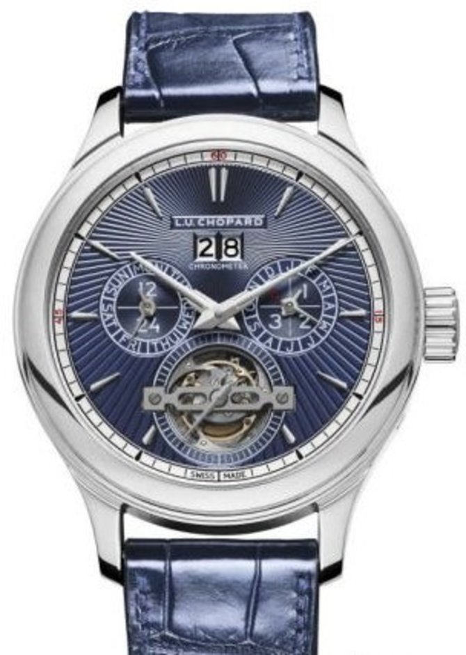 Швейцарские часы Chopard L.U.C All-In-One 161925-9003 в 2019 году выпустила часовая мануфактура Chopard. Модель выполнена из платины в размере 46 x 18.5 мм. Внутри платинового корпуса установлен швейцарский мануфактурный механизм с ручным заводом - калибр L.U.C 05.01-L, что отличается вечным календарем и турбийоном. К тому же, механизм отмечен сертификатом хронометра от COSC и женевским клеймом. На циферблате сквозь защитное стекло из сапфира показывается такой набор данных: часы, минуты, секунды, дата, день недели, месяц, запас хода, фаза луны, цикл високосного года, указатель день/ночь, уравнение времени, время восхода/захода солнца, запас хода. Ремень пошит из кожи аллигатора синего цвета и укомплектован платиновой застежкой классического образца. Корпус герметичен до 30 метров. Стекло из сапфирового кристалла установлено и с лицевой стороны, и с задней. Запас хода механизма рассчитан на 7 дней работы. Данная модель была выпущена в 2019 году ограниченной серией 10 экземпляров.