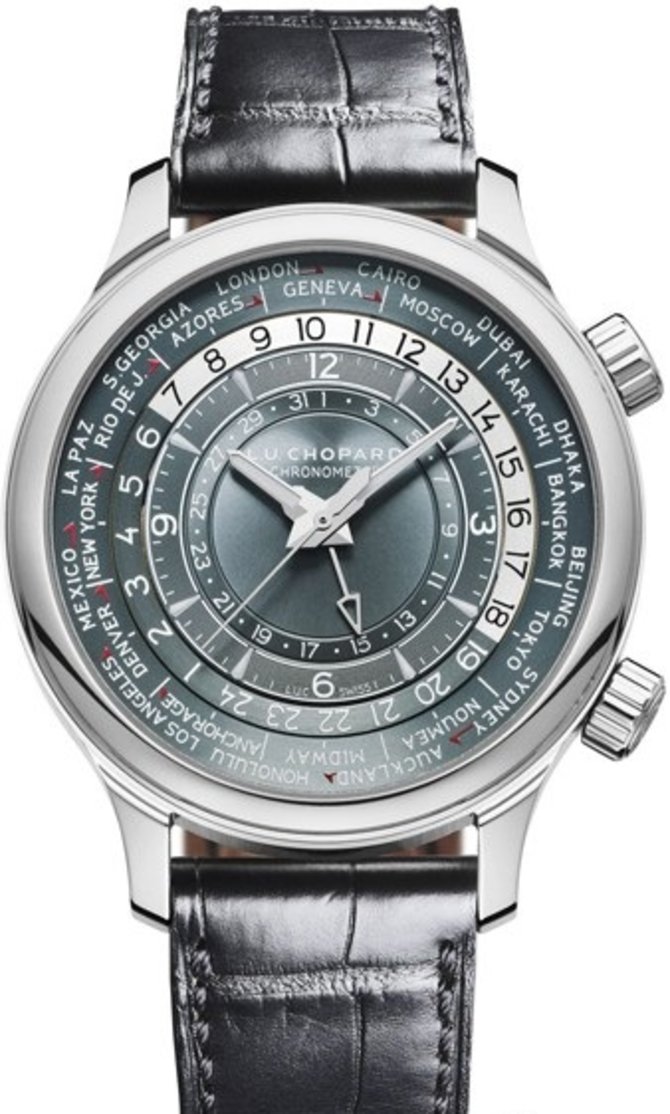 Идеальный аксессуар в виде наручных часов Chopard L.U.C Time Traveler One 161942-9001 станет незаменимым помощником мужчине, любящему элегантность и ценящему высокое качество. Модель обладает высокоточными техническими характеристиками; механизм L.U.C 01.05-L с функцией автоматического подзавода, индикацией времени второго часового пояса, даты, дня/ночи и времени 24-х городов. 42-миллиметровый корпус, полированный вручную и имеющий круглую форму, выполнен из чистой платины. Запас хода механизма - часов. Платиновый корпус отличается -метровой водонепроницаемостью. Ремешок пошит вручную из кожи аллигатора.