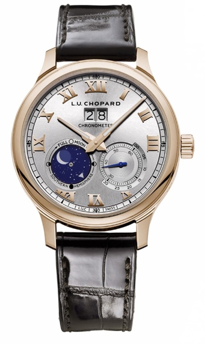 Астрономические часы с сертификатом хронометра СOSC от мануфактуры Chopard в корпусе из розового золота, 42 мм в диаметре. В 11-миллиметровой толщине поместился калибр L.U.C 96.20-L с автоматическим подзаводом. Благодаря нему на циферблате часов указываются такие функции: часы, минуты, секунды, дата, фаза луны. Кожа аллигатора черного цвета послужила материалом для производства ремешка. Застежка классическая. Механизм имеет запас хода в 65 часов. Корпус с герметичностью в 50 метров. Увеличенная дата. Cтекло сапфировое.