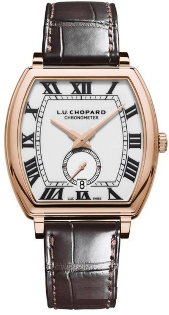 Швейцарские часы Chopard, модель Heritage Grand Cru (реф. 162296-5001), были помещены в коллекцию L.U.C. Корпус часов имеет форму бочки. Он выполнен из розового золота. Габариты корпуса: 38.5 x 38.8 х 7.74 мм. Водонепроницаемость корпуса - до 30 метров. На белом циферблате размещена разметка черного цвета в виде римских цифр, стрелки из золота для индикации часов и минут, а также внизу циферблата размещен индикатор даты. Ремень из кожи аллигатора и пряжка из золота - комплектация наручных часов. Механизм часов оснащен функцией автоматического подзавода. Разработка механизма принадлежит специалистам мануфактуры Chopard. Бочкообразный циферблат закрыт стеклом из сапфира с антибликовыми свойствами.