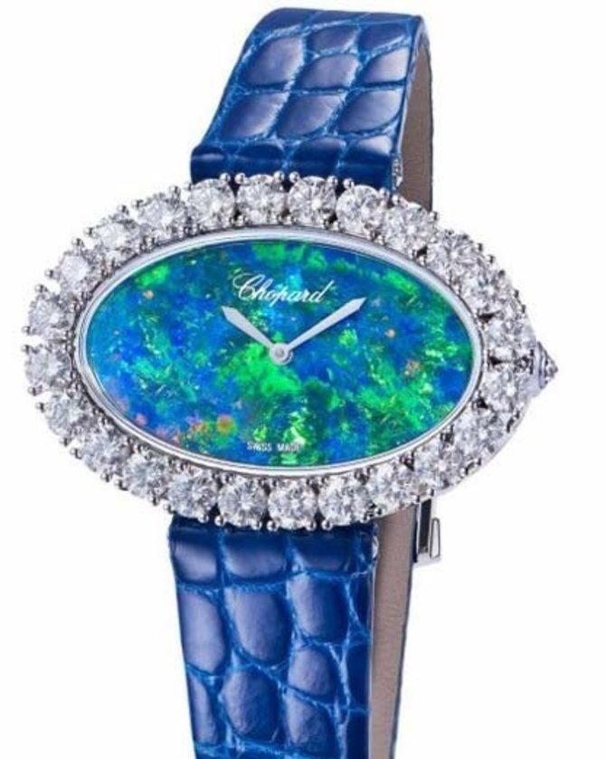 Эксклюзивные овальные швейцарские часы в корпусе из высококачественного белого золота, размером 39.5 х 33.4 мм, с инкрустацией белыми бриллиантами представлены компанией Chopard и помещены в коллекцию High Jewellery. Водонепроницаемость ювелирного женского корпуса составляет 3 бар, что позволяет погружаться с часами под воду до 30 метров глубины. Опаловый зеленый циферблат защищен стеклом из сапфирового кристалла. Часы и минуты показываются стрелками из белого золота. Часовые метки отсутствуют. Внутри часов установлен кварцевый механизм разработки Chopard. Часы укомплектованы ремешком из кожи аллигатора синего цвета и застежкой из белого золота. Модель выпущена лимитированным тиражом - 1 экземпляр на весь мир!