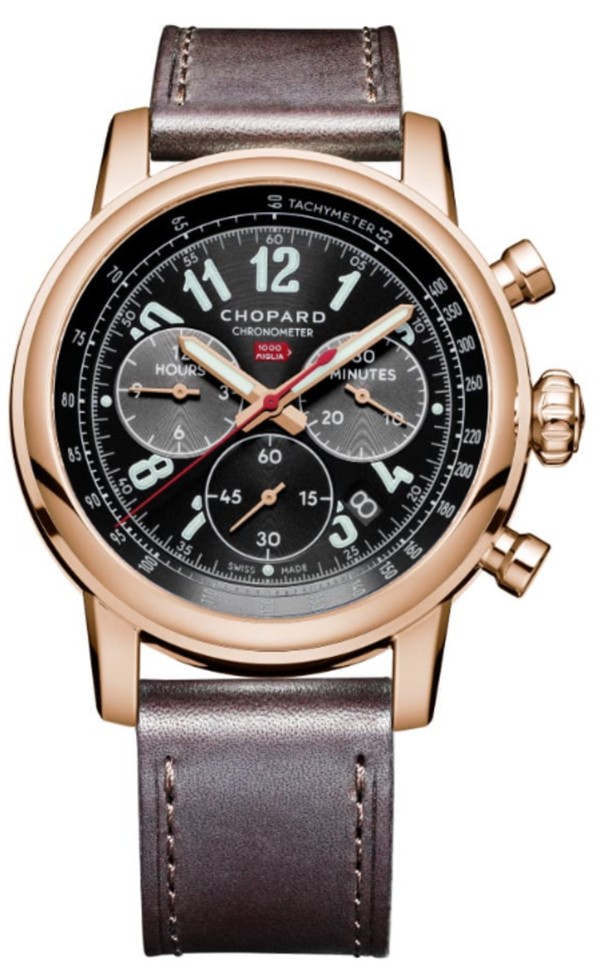Разработка компании Сhopard 2016 года - модель наручных часов с хронографом в корпусе из розового золота, диаметром 46 миллиметров. Корпус способен выдержать давление воды на уровне 50-метровой глубины (5 атм). Функциональность часов обеспечивает мануфактурный часовой механизм с автоподзаводом, отмеченный COSC сертификатом хронометра. Он гарантирует индикацию часов, минут, секунд, даты и данных хронографа. Циферблат закрыт выпуклым сапфировым стеклом с антибликовым покрытием. Толщина корпуса - 14.17 мм. Ремешок пошит из натуральной телячьей кожи и дополнен раскладной пряжкой из 18-каратного розового золота. На пряжку нанесен брендовый логотип Сhopard.