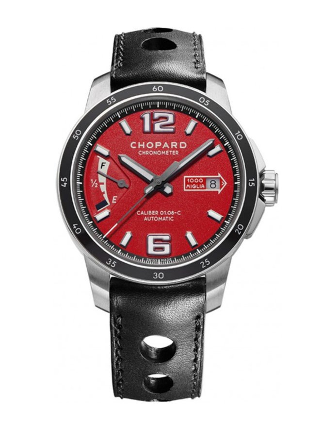 Швейцарская часовая мануфактура Chopard в 2015 году пополнила свою коллекцию Mille Miglia двумя моделями наручных часов на автоматическом калибре Chopard 01.08-C с 60-часовым запасом хода и функциями индикации часов, минут, секунд, даты и уровня запаса хода специальным стильным индикатором. Часы выпускаются в двух корпусах: из розового золота и нержавеющей стали. Диаметр корпуса - 43 миллиметра; толщина - 11.43 миллиметра. Циферблат закрыт прочным сапфировым стеклом. Часы комплектуются ремешком из натуральной кожи с раскладывающейся застежкой из того же материала, из которого произведен корпус. Герметичность корпуса - 100 метров. Ограниченная серия - 1000 экземпляров. Механизм сертифицирован COSC, поэтому по праву носит статус хронометра.