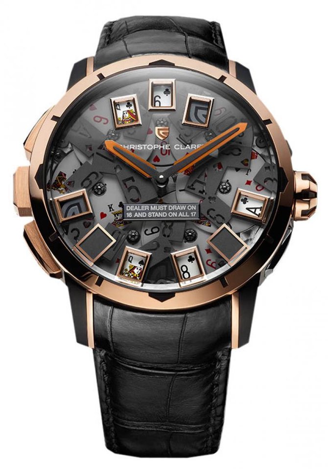 Производитель Christophe Claret представляет Вашему вниманию очередную модель мужских наручных часов из коллекции "21 BlackJack" - MTR.BLJ08.030-051. Прежде всего хотелось бы обратить внимание на нестандартность модели. Благодаря необычному дизайну, данная модель привлекает к себе особое внимание. Корпус круглый, комбинировнный, выполнен из титана и 18-каратного розового золота, и имеет такие параметры: 45 мм в диаметре. Автоматический механизм оснащен калибром BLJ08, и имеет запас хода на 72 часа. Циферблат серого цвета, выполнен по мотиву "игральные карты". На данном циферблате великолепно смотрятся, отлитые вручную стрелки. Водостойкость модели составляет 100 футов, что равняется 30 метрам. Ремешок черный, выполнен из кожи аллигатора, оснащен титановой вставкой и раскладывающейся застежкой. Также стоит упомянуть про игры, которые есть в данных часах, а именно: блекджек со звуковыми сигналами, игральные кости и рулетка. Серия данной модели ограничена в 21 экземпляр.