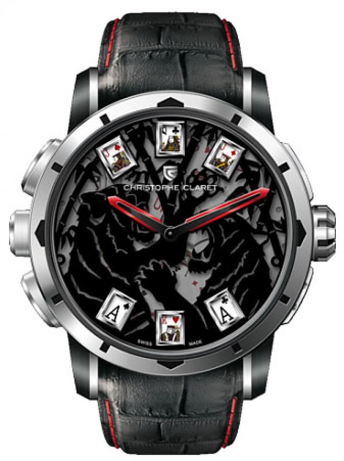 Известная во всем мире компания Christophe Claret, представляет очередную великолепную модель мужских наручных часов, из коллекции Baccara, MTR.BCR09.040-049. Данная модель отличается нестандартным шикарным дизайном, функциональностью и в тоже время простотой. Функциональность модели подчеркивает наличие репетира. Круглый полированный, комбинированный корпус выполнен из 18-каратного белого золота, титана и покрытия PVD и имеет такие параметры: 45 мм в диаметре. Автоматический механизм оснащен калибром BCR09, и имеет запас хода на 72 часа. На серебристо-сером циферблате, выполненном по мотиву "тигр", великолепно смотрятся вручную отлитые стрелки. Прочные стекла, устойчивые к царапинам и другим повреждениям выполненные из сапфира, закрывают корпус часов с обеих сторон. Ремешок черного цвета, сделан из кожи аллигатора, оснащен раскладывающейся застежкой, а также вставкой из 18-каратного белого золота. Водостойкость модели составляет 100 футов, что равняется 30 метрам. Также стоит обратить внимание на три игры, которые присутствуют в данной модели, а именно:баккара со звуковыми сигналами, рулетка и игральные кости. Серия данной модели ограничена всего лишь в 9 экземпляров.