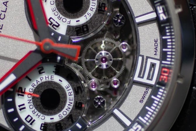 Известная во всем мире компания Christophe Claret, представляет очередную великолепную модель мужских наручных часов, из коллекции Kantharos, MTR.MBA13.902. Данная модель отличается четким классическим шикарным дизайном, функциональностью и в тоже время простотой. Функциональность модели подчеркивает наличие хронографа. Круглый полированный, комбинированный корпус выполнен из титана и покрытия DLC, и имеет такие параметры: 45мм в диаметре. На серебристо-черном циферблате, великолепно смотрятся вручную отлитые стрелки из вороненной стали. Прочные стекла, устойчивые к царапинам и другим повреждениям выполненные из сапфира, закрывают корпус часов с обеих сторон. Благодаря задней прозрачной крышке, можно наблюдать за работой точного механизма. Ремешок черного цвета, сделан из кожи аллигатора, оснащен раскладывающейся застежкой, а также вставкой из титана. Водостойкость модели составляет 100 футов, что равняется 30 метрам. Ещё одна особенность модели, хронограф оснащен гонгом.