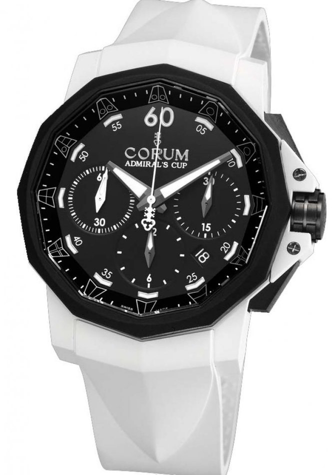 Продолжаем знакомиться с изделиями от всемирно известного швейцарского производителя часов Corum, основанного в 1955 году. Рассмотрим коллекцию, которая называется Admiral`s Cup Challenger. Модель 753.805.02/F379 AN21 это часы, которые подтверждают статус производителя. Двенадцатигранный корпус часов из нержавеющей стали с PVD-покрытием и нанесённым каучуком. Размеры корпуса составляют 44 мм. Основные функции данной модели это часы, минуты, секунды, отображение даты. Данная модель оснащена хронографом и имеет сертификат швейцарской Службы официального контроля за хронометрами (COSC). На черном циферблате, с белыми маркерами, находятся отлитые из вороненной стали стрелки, которые закрыты под прочным сапфировым стеклом с антибликовым покрытием, благодаря которому не стоит беспокоиться о повреждениях и царапинах. Заводной ключ находится по стандарту на позиции трех часов. Ремешок часов выполнен из каучука со вставкой из нержавеющей стали. Механизм завода - автоматический, оснащён калибром СО 753, запас хода составляет 48 часов. Что касается водонепроницаемости, то она увеличена по сравнению со стандартами, и составляет сто метров.