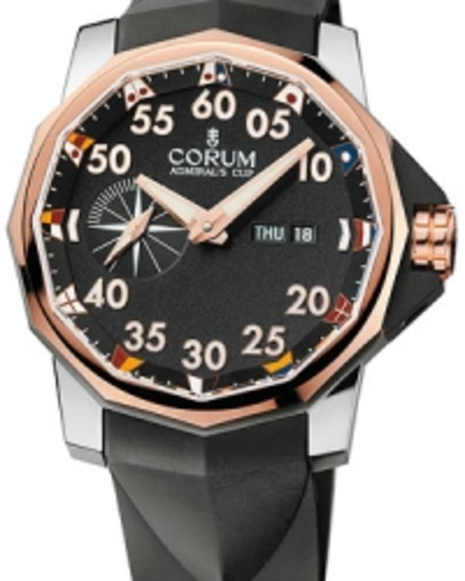 Продолжаем знакомиться с изделиями от всемирно известного швейцарского производителя часов Corum, основанного в 1955 году. Рассмотрим коллекцию, которая называется Admiral`s Cup Challenger. 947.931.05/0371 AN32 это часы которые подтверждают статус производителя. Узнаваемый двенадцатигранный корпус часов изготовлен из титана, безель из розового 18-каратного золота. Размеры корпуса составляют 48 мм. Модель оснащена функциями индикации часов, минут, секунд и экраном отображения даты и дня недели, расположенном на позиции трех часов. Данная модель имеет сертификат швейцарской службы официального контроля за хронометрами (COSC). На черном циферблате нанесены золотистые маркеры минут, маркеры часов изображены с помощью цветных морских вымпелов. Прочное сапфировое стекло с антибликовым покрытием, защищает часы от повреждений и царапин. На торце заводного ключа выгравирована эмблема бренда Corum – ключ. Возможность спуска под воду до 300 метров. Ремешок часов изготовлен из каучука с прочной титановой застёжкой. Механизм завода - автоматический, оснащён калибром СО 947, запас хода составляет 42 часа.