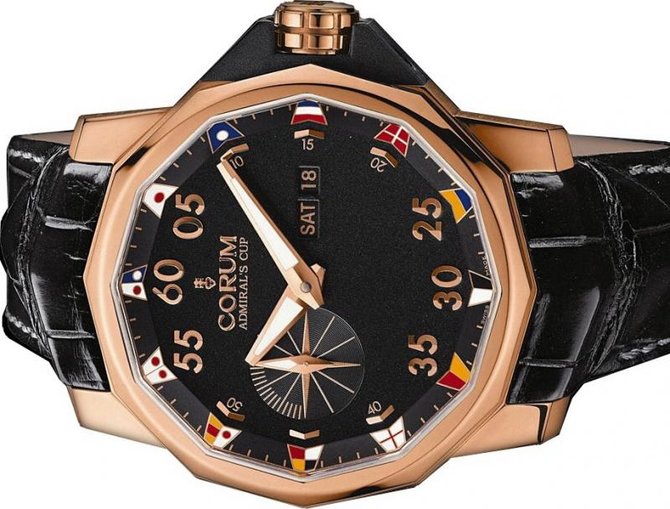 Продолжаем знакомиться с изделиями от всемирно известного швейцарского производителя часов Corum, основанного в 1955 году. Рассмотрим коллекцию, которая называется Admiral`s Cup Challenger. 947.941.55/0081 AN52 это часы которые подтверждают статус производителя. Узнаваемый двенадцатигранный корпус часов изготовлен из розового 18-каратного золота. Размеры корпуса составляют 48 мм. Модель оснащена функциями индикации часов, минут, секунд и экраном отображения даты и дня недели, расположенном на позиции трех часов. Также на позиции 9 часов находится компас. На черном циферблате нанесены золотистые маркеры минут, маркеры часов изображены с помощью морских вымпелов. Прочное сапфировое стекло с антибликовым покрытием, защищает часы от повреждений и царапин. На торце заводного ключа выгравирована эмблема бренда Corum – ключ. Возможность спуска под воду до 300 метров. Ремешок часов изготовлен из кожи аллигатора с застёжкой из розового золота. Механизм завода - автоматический, оснащён калибром СО 947, запас хода составляет 42 часа.