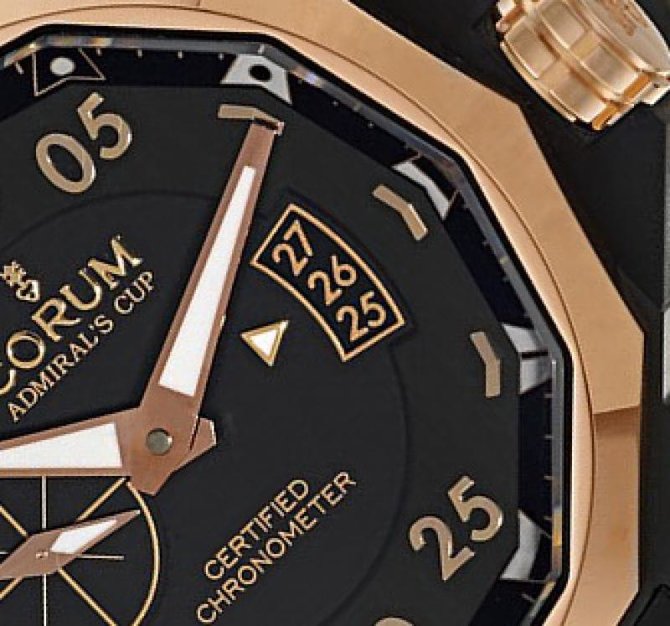 Продолжаем знакомиться с изделиями от всемирно известного швейцарского производителя часов Corum, основанного в 1955 году. Рассмотрим коллекцию, которая называется Admiral`s Cup Challenger. 947.951.86/0371 AN24 это часы которые подтверждают статус производителя. Узнаваемый двенадцатигранный корпус часов изготовлен из титана с PVD-покрытием, безель - из розового 18-каратного золота. Размеры корпуса составляют 48 мм. Модель оснащена функциями индикации часов, минут, секунд и экраном отображения даты расположенном на позиции трёх часов. На черном гильошированном циферблат нанесены золотистые маркеры минут, маркеры часов изображены с помощью морских вымпелов. Данная модель имеет сертификат швейцарской службы официального контроля за хронометрами (COSC). Прочное сапфировое стекло с антибликовым покрытием, защищает часы от повреждений и царапин. На торце заводного ключа выгравирована эмблема бренда Corum – ключ. Водонепроницаемость - 300 метров. Ремешок часов изготовлен из каучука с прочной застёжкой из титана. Механизм завода - автоматический, оснащён калибром СО 947, запас хода составляет 42 часа.
