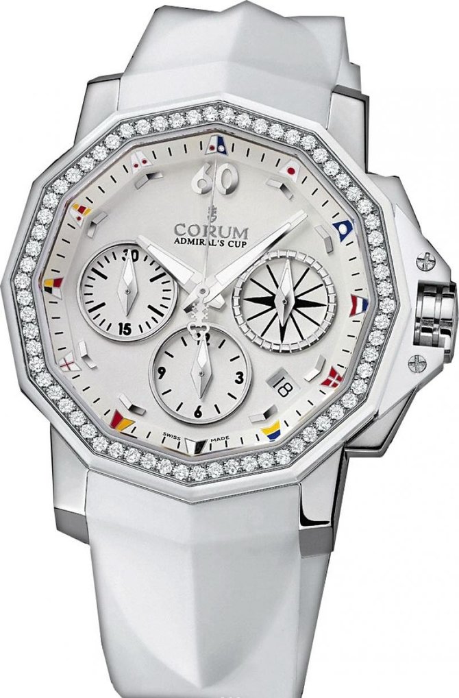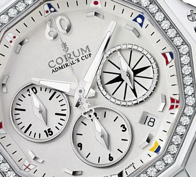 Продолжаем знакомиться с изделиями от всемирно известного швейцарского производителя часов Corum, основанного в 1955 году. Admiral`s Cup Challenger 40 Chrono Diamonds 984.970.47/F379 AA12 это женская версия часов, воплотившая в себе как спортивный дух, так и элегантность. Корпус часов изготовлен из нержавеющей стали со вставками из каучука. Безель инкрустирован 66-ю белыми бриллиантами. Размеры корпуса 40 мм. Модель оснащена функциями индикации часов, минут, секунд и экраном отображения даты расположенном на позиции между 4 и 5 часами. На позиции 6 и 9 часов расположены счётчики хронографа (12- часовой и 30-минутный). Данная модель имеет сертификат швейцарской службы официального контроля за хронометрами (COSC). На белом циферблате нанесены серебристые маркеры часов и минут, на фланце, легко узнаваемые бренд, цветные изображения морских вымпелов. Прочное сапфировое стекло с антибликовым покрытием, защищает часы от повреждений и царапин.На торце заводного ключа выгравирована эмблема бренда Corum – ключ. Над заводным ключом находится кнопка запуска хронографа, ниже ключа - кнопка сброса. Механизм завода - автоматический, оснащён калибром СО 984, запас хода составляет 42 часа. Ремешок часов изготовлен из каучука с застёжкой из нержавеющей стали. Что касается водонепроницаемости, то она составляет сто метров.